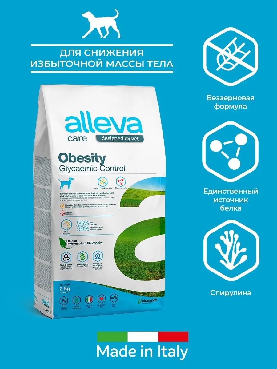 Alleva Care Dog Adult Obesity Glycaemic Control / Полнорационный сухой диетический корм Аллева Обесити Контроль потребления глюкозы, предназначенный для снижения избыточной массы тела, а также контроля потребления глюкозы (сахарного диабета). Корм также показан для поддержки липидного обмена в случае гиперлипидемии.