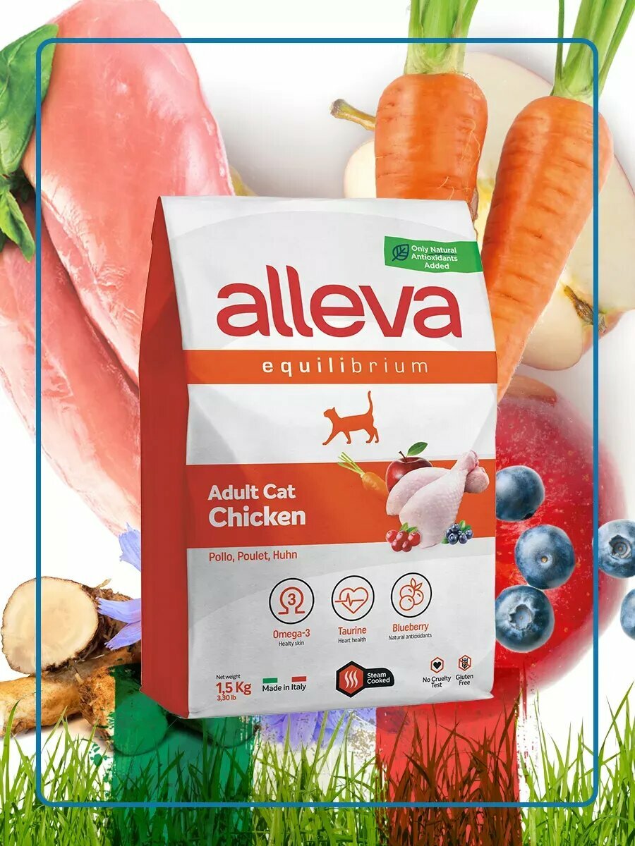 Alleva Equilibrium Chicken/ Полнорационный сухой корм Аллева Эквилибриум с курицей для взрослых кошек. Alleva — полнорационные корма для кошек и собак, гарантия правильного и здорового питания для каждого питомца, строгий контроль качества на каждом этапе производства, лучшее отборное сырье и натуральные фитонутриенты. Серия Equilibrium — продукты, приготовленные по собой формуле на пару, для животных с чувствительным пищеварением и склонностью к аллергиям, специальный корм для котят, а также стерилизованных кошек и кастрированных котов. В состав кормов Alleva Equilibrium добавлены фрукты и овощи (черника, клюква, яблоко и морковь) в качестве дополнительного источника растворимой клетчатки, витаминов и минералов, а также природных антиоксидантов, которые обеспечивают свежесть корма на протяжении всего срока годности. Регулярное потребление корма Alleva Equilibrium устраняет дискомфортные ощущения в желудке и кишечнике животного, способствует заживлению микротрещин и расчесов на коже. Гарантированный анализ: сырой протеин – 33,00%, сырой жир – 15,00%, сырая клетчатка – 2,50%, сырая зола – 7,90%, Кальций – 1,40%, Фосфор – 1,00%, Магний - 0,06%; Омега-6 – 1,30%, Омега-3 – 0,40%. Энергетическая ценность: 3845 ккал/кг; 16,15 МДж/кг.