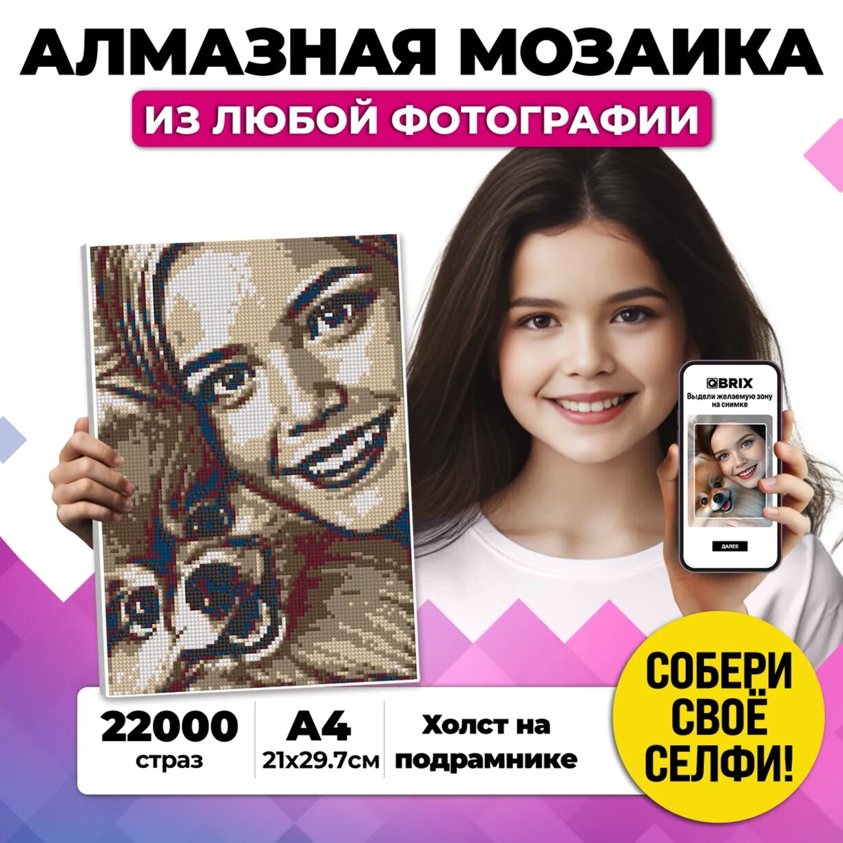 | Дополнительная информация | С чего начать? 1. Покупаете набор алмазной мозаики на подрамнике А3 от QBRIX; 2. Заходите на официальный сайт производителя в раздел «Алмазная фото-мозаика»; 3. Вводите индивидуальный код и загружаете желаемую фотографию; 4. Выбираете понравившийся вариант сборки; 5. Получаете инструкцию и приступаете к созданию картины. |