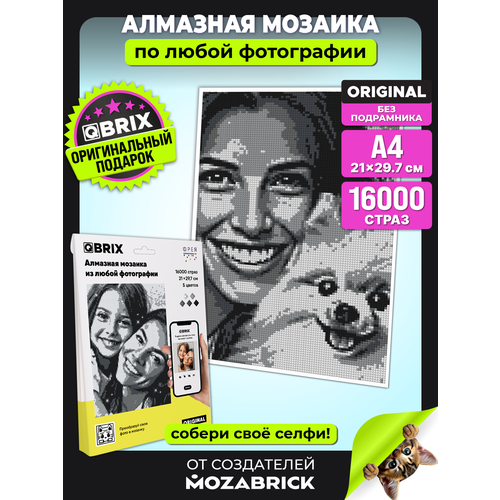 3. Собираете собственную фотографию. Алмазная мозаика - это уникальный подарок для близких, друзей, детей и второй половинки! Наборы представлены в трех цветовых вариантах: VINTAGE, ORIGINAL и POP-ART. Картина имеет полную выкладку квадратными стразами, а собирать вы можете все, будь то ваш портрет, цветы, животные, кот, кошка, собака, лошадь, сова, лев, игрушка или икона. QBRIX производит наборы алмазной мозаики по фото на холстах разных размеров: формат А3 (29,7х42 см) и формат А4 (21х29,7 см).