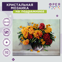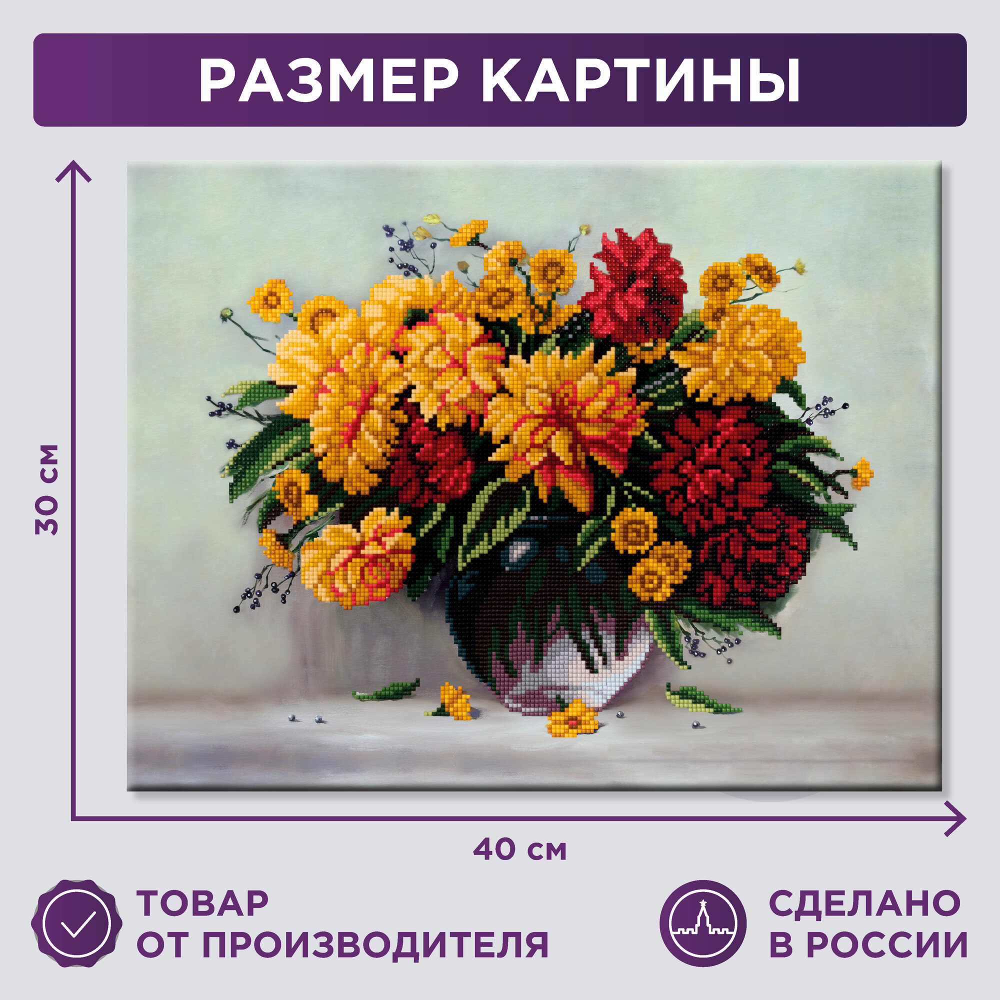 Алмазная мозаика на подрамнике ALPD-087 Георгины ТМ Фрея - это прекрасный набор для тех, кто увлечен творчеством и рукоделием. Размер готовой работы 40х30 см. Выполнение работы не требует специальных навыков, выкладывать картину очень легко и быстро, подходит для взрослых и детей: женщин и мужчин, девочек и мальчиков. Холст уже натянут на деревянный подрамник, поэтому вам не потребуется оформление в багет. В состав входят все необходимое: холст с клеевым слоем и защитной плёнкой, на деревянном подрамнике с подложкой, квадратные стразы: 20 цветов (с запасом 20%), стилус и гель-клей для страз, пластиковый лоток, крепление, пакеты зип-лок. Благодаря тому, что под холстом находится подложка, исключается возможность провисания основы при выкладывании картины. Стразы наклеиваются поверх изображения со схемой на уже нанесенный клеевой слой. Частичная выкладка.