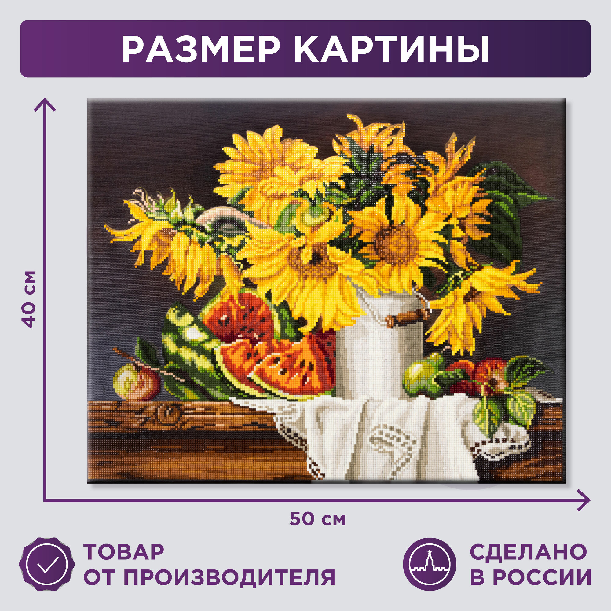 Алмазная мозаика на подрамнике ALPD-054 Натюрморт с арбузом ТМ Фрея - это прекрасный набор для тех, кто увлечен творчеством и рукоделием. Размер готовой работы 50х40 см. Выполнение работы не требует специальных навыков, выкладывать картину очень легко и быстро, подходит для взрослых и детей: женщин и мужчин, девочек и мальчиков. Холст уже натянут на деревянный подрамник, поэтому вам не потребуется оформление в багет. В состав входят все необходимое: холст с клеевым слоем и защитной плёнкой, на деревянном подрамнике с подложкой, квадратные стразы: 27 цветов (с запасом 20%), стилус и гель-клей для страз, пластиковый лоток, крепление, пакеты зип-лок. Благодаря тому, что под холстом находится подложка, исключается возможность провисания основы при выкладывании картины. Стразы наклеиваются поверх изображения со схемой на уже нанесенный клеевой слой. Частичная выкладка.