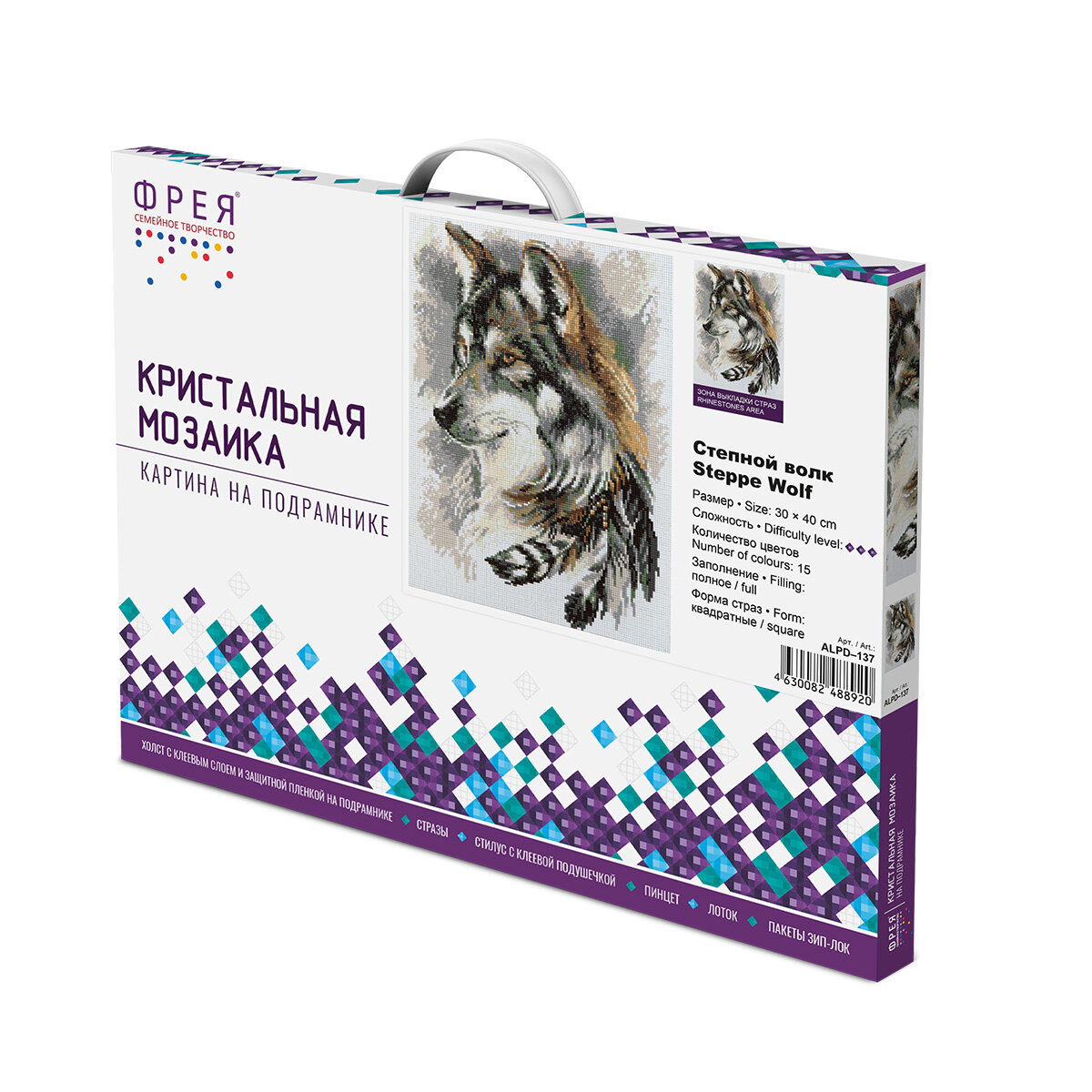 Алмазная мозаика на подрамнике ALPD-137 Степной волк ТМ Фрея - это прекрасный набор для тех, кто увлечен творчеством и рукоделием. Размер готовой работы 30х40 см. Выполнение работы не требует специальных навыков, выкладывать картину очень легко и быстро, подходит для взрослых и детей: женщин и мужчин, девочек и мальчиков. Холст уже натянут на деревянный подрамник, поэтому вам не потребуется оформление в багет. В состав входят все необходимое: холст с клеевым слоем и защитной плёнкой, на деревянном подрамнике с подложкой, квадратные стразы: 15 цветов (с запасом 20%), стилус и гель-клей для страз, пластиковый лоток, крепление, пакеты зип-лок. Благодаря тому, что под холстом находится подложка, исключается возможность провисания основы при выкладывании картины. Стразы наклеиваются поверх изображения со схемой на уже нанесенный клеевой слой. Полная выкладка.