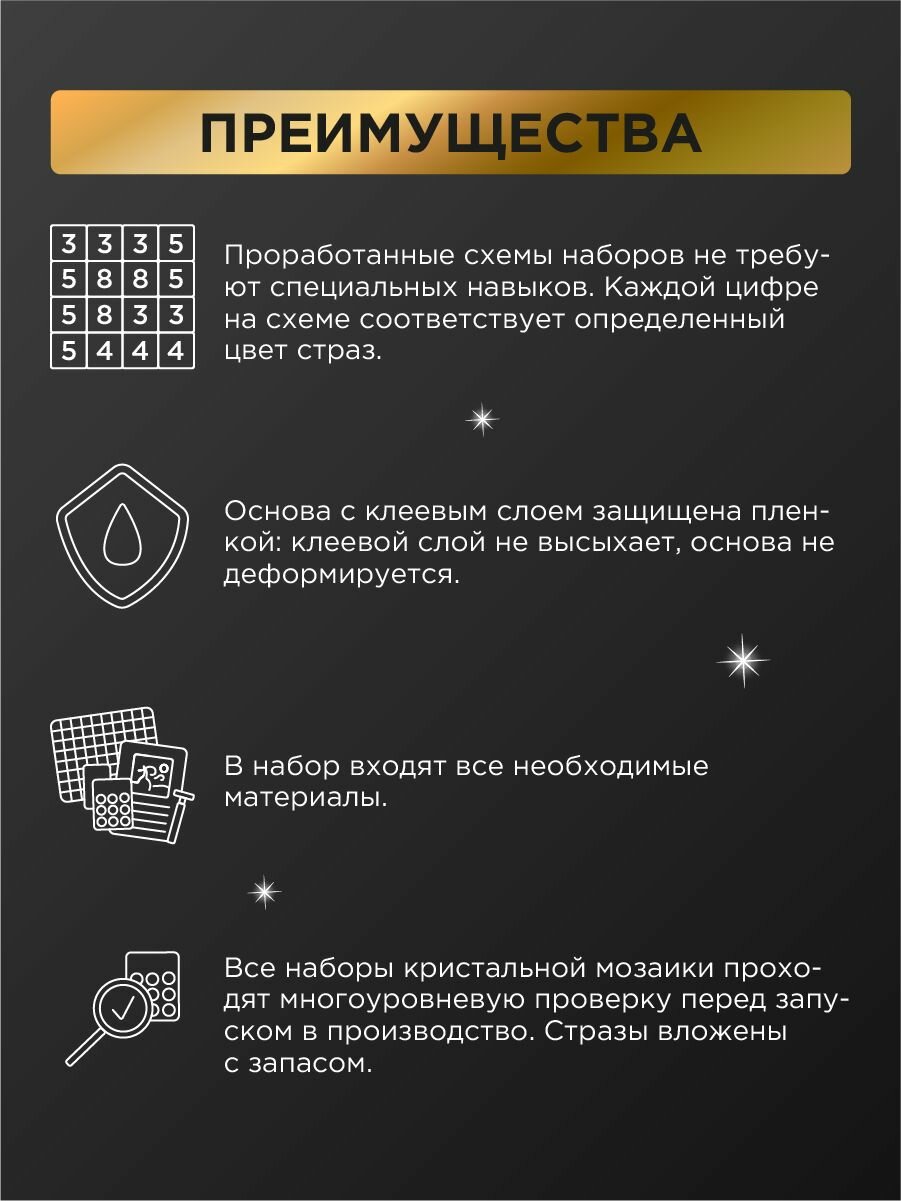 Готовую интерьерную картину можно повесить на стену, при помощи специального крепления, входящего в набор, или поставить на полку, украсив детскую, спальню, гостиную или кухню. Алмазная вышивка - это творческий набор, где увлекательный процесс создания картинок поможет развить мелкую моторику, став вашим любимым хобби. Это отличный мини подарок на новый год, день рождения, 8 марта: для дочери, коллеги или подруги, на 14 и 23 февраля. В ассортименте ТМ Фрея так же представлены картины с алмазной мозаикой на холсте с подрамником 40х50 и 30х40 с частичной и полной выкладкой, с разнообразными милыми сюжетами: цветы, собаки, тигры, природа, сердечки, иконы, котята, море, любовь, новогодние дизайны, кот, art и т. д. Товары для рукоделия и творчества - это бесконечная реализация вашего вдохновения.