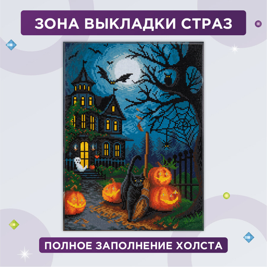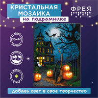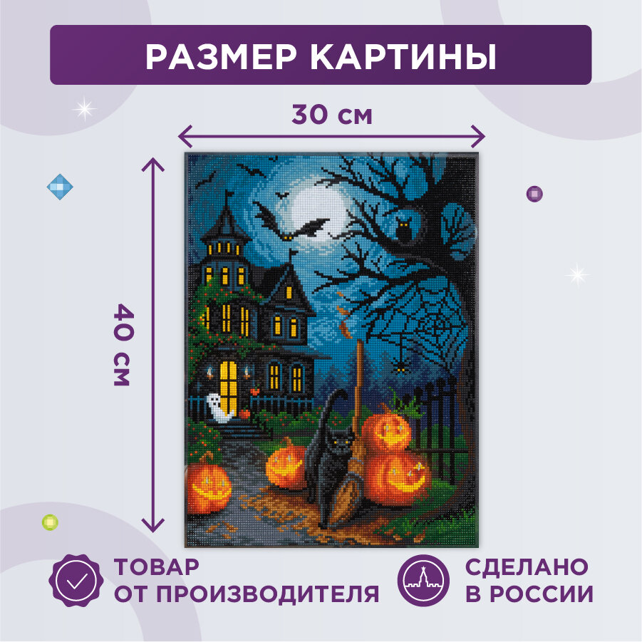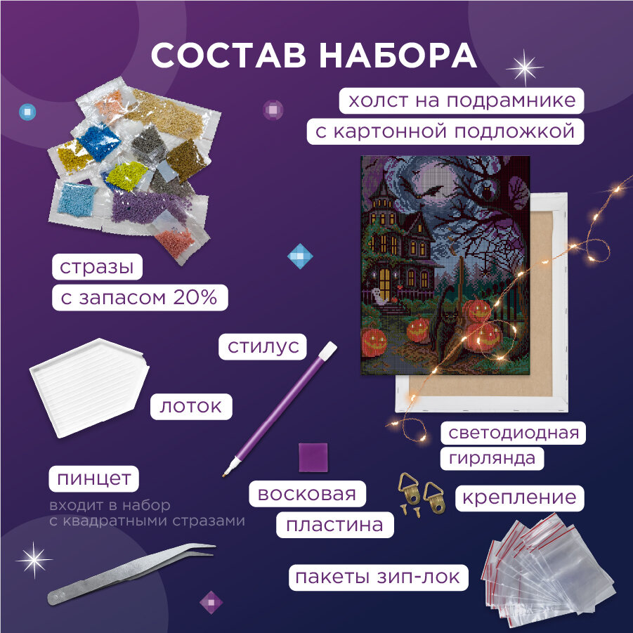 Алмазная мозаика на подрамнике светящаяся ALDD-260 Хэллоуин ТМ Фрея - это прекрасный набор для тех, кто увлечен творчеством и рукоделием. Размер готового изделия 50х40 см. Готовая картина станет еще эффектнее! Благодаря светодиодной гирлянде, каждая деталь сюжета заиграет новыми красками. Огоньки добавят объем и усилят атмосферу композиции. Выполнение работы не требует специальных навыков, выкладывать картину очень легко и быстро, подходит для взрослых и детей: женщин и мужчин, девочек и мальчиков. В состав входят все необходимое: тканая основа с клеевым слоем и защитной плёнкой, квадратные стразы 24 цвета (с запасом 20%), пинцет, стилус и гель-клей для страз, светодиоды, лоток, пакеты зип-лок. Стразы наклеиваются поверх изображения со схемой на уже нанесенный клеевой слой. Благодаря граненым акриловым стразам, неповторимый блеск готовой работы напоминает мерцание настоящих кристаллов. Полная выкладка.