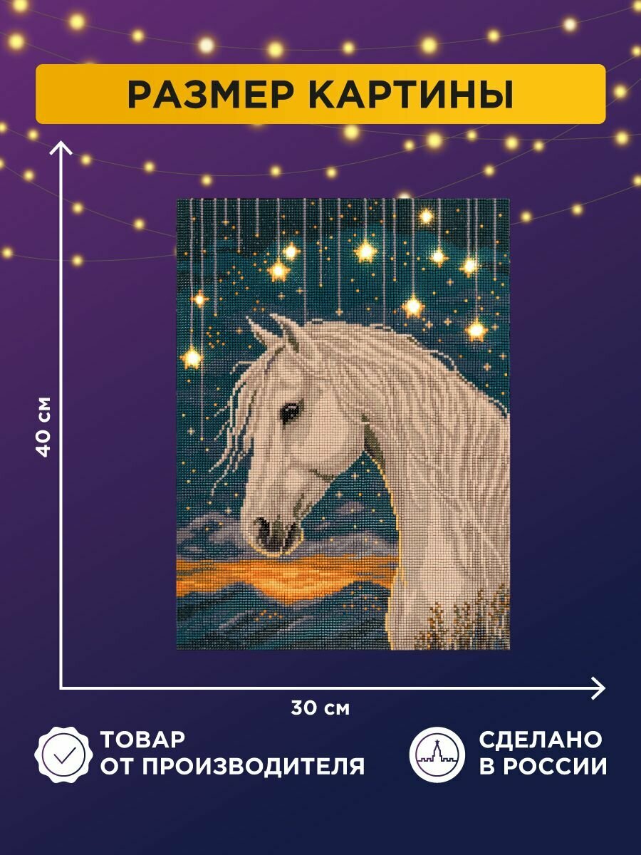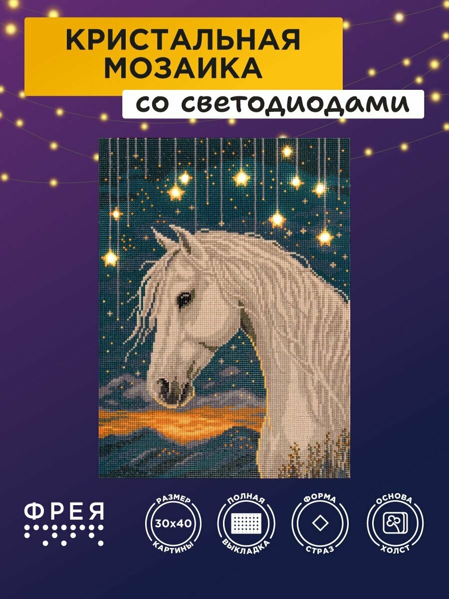 Алмазная мозаикана подрамнике светящаяся ALDD-315 Лунный конь ТМ Фрея - это прекрасный набор для тех, кто увлечен творчеством и рукоделием. Размер готового изделия 30х40 см. Готовая картина станет еще эффектнее! Благодаря светодиодной гирлянде, каждая деталь сюжета заиграет новыми красками. Огоньки добавят объем и усилят атмосферу композиции. Выполнение работы не требует специальных навыков, выкладывать картину очень легко и быстро, подходит для взрослых и детей: женщин и мужчин, девочек и мальчиков. В состав входят все необходимое: тканая основа с клеевым слоем и защитной плёнкой, квадратные стразы 16 цветов (с запасом 20%), пинцет, стилус и гель-клей для страз, светодиоды, лоток, пакеты зип-лок. Стразы наклеиваются поверх изображения со схемой на уже нанесенный клеевой слой. Благодаря граненым акриловым стразам, неповторимый блеск готовой работы напоминает мерцание настоящих кристаллов. Полная выкладка.