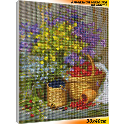 Набор для творчества Алмазная мозаика на подрамнике. Летние ягоды Блестящая картина из квадратных камней 2.5*2.5 мм. в размере 30*40 см. Основа картины – холст, натянутый на подрамник, для придания крепости конструкции подрамник усилен листом оргалита. На холст нанесена цветная схема с контрастными условными обозначениями, схему покрывает высококачественный клеевой слой, сверху слой закрыт пленкой. Комплект квадратных камней расфасован по цветам в отдельные пакеты, на каждом пакете есть наклейка с номером цвета и условным обозначением. Материал камней – композитный, на основе эпоксидной смолы, благодаря форме камней картина собирается без зазоров и по готовности получается красивое мерцающие изображение. Для этого размера дополнительно можно приобрести багетную раму. Блестящие воспроизведение оригинала!
