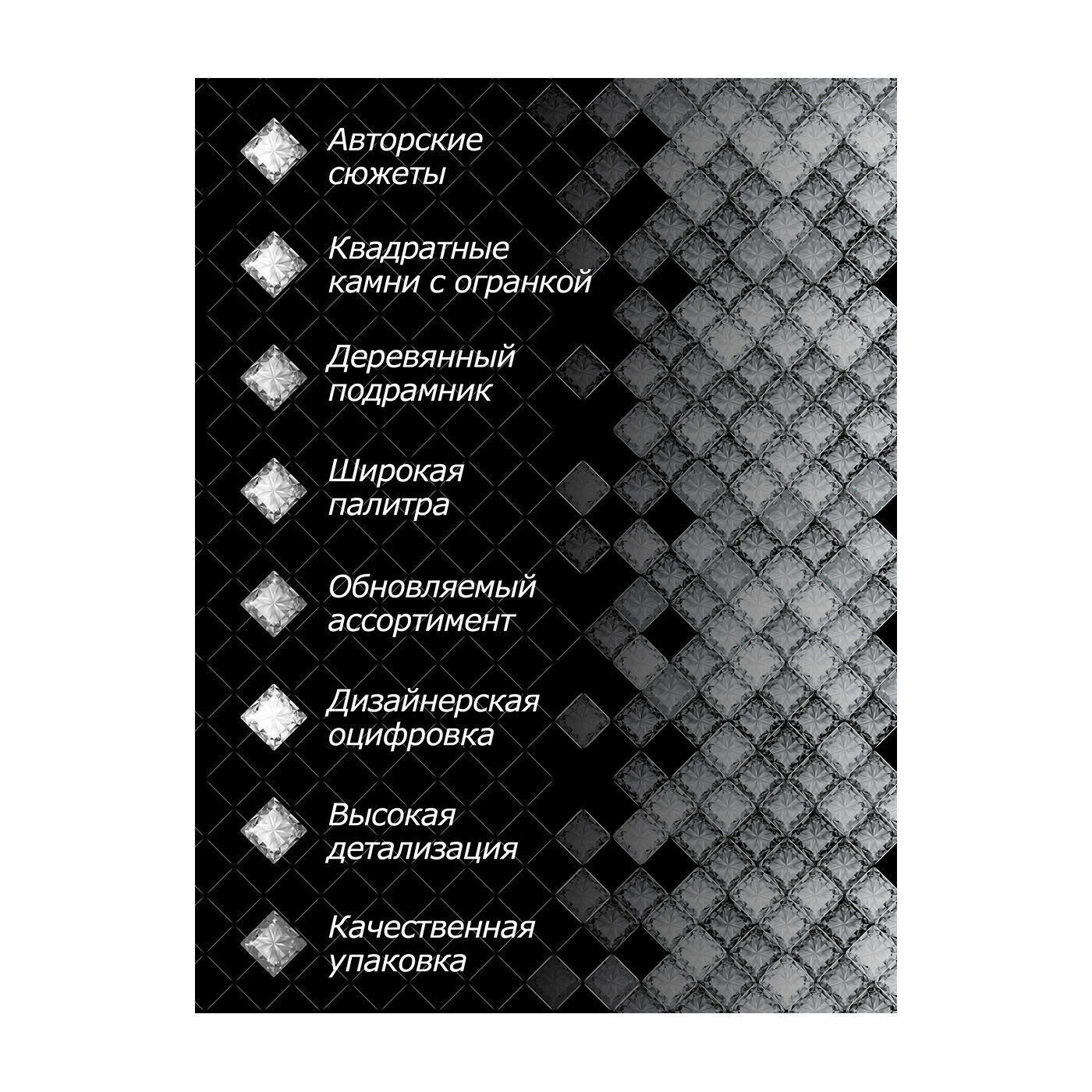 | Особенности | лоток для страз, пинцет, подрамник, с буквами, с цифрами, стилус, холст, цветная схема |