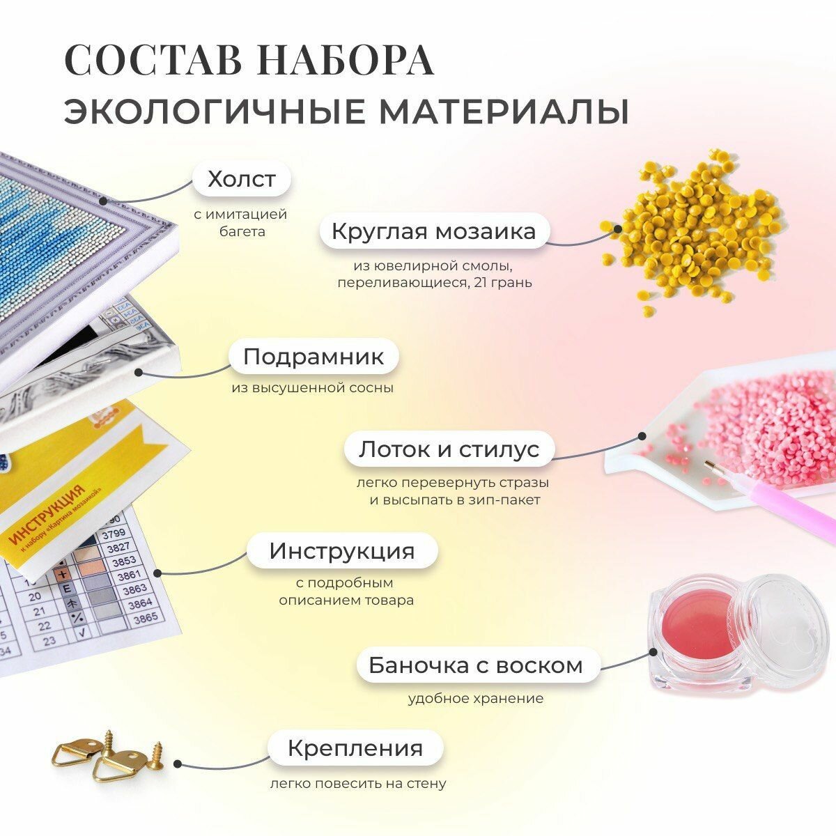 В набор входит: Холст на деревянных рейках, яркая печать схемы на холсте, защитная прозрачная пленка, безопасный клеевой слой, пронумерованные пакетики с мозаикой, зип-пакеты, подробная инструкция, лист со схемой выкладки мозаики, подарочная коробка с ручкой и кратким описанием набора, специальный пластиковый карандаш для захвата мозаики, баночка с липким воском для карандаша, пластиковый пинцет для альтернативного способа выкладки, лоток для мозаики.