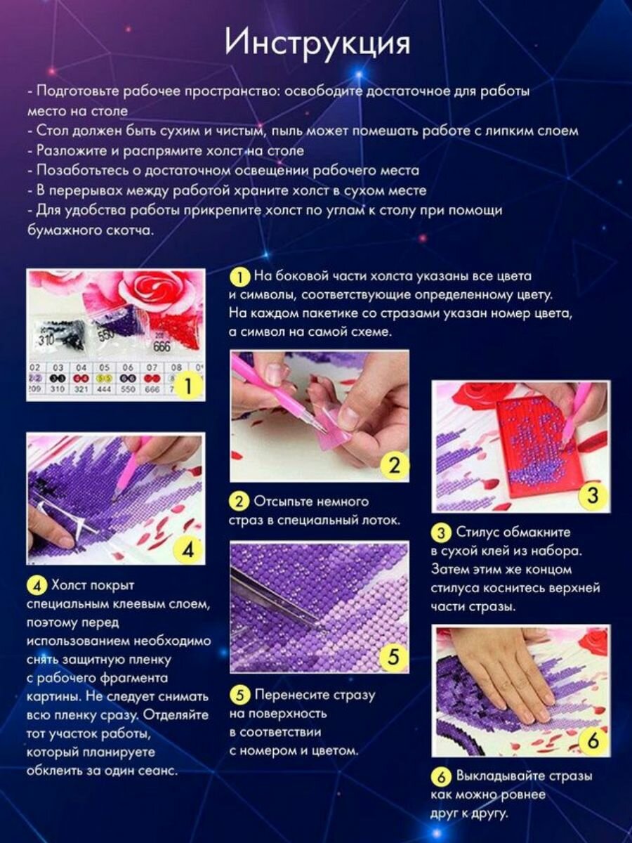 В набор входит: холст с нанесенным рисунком, стразы, лоток для страз, стилус, сухой клей.