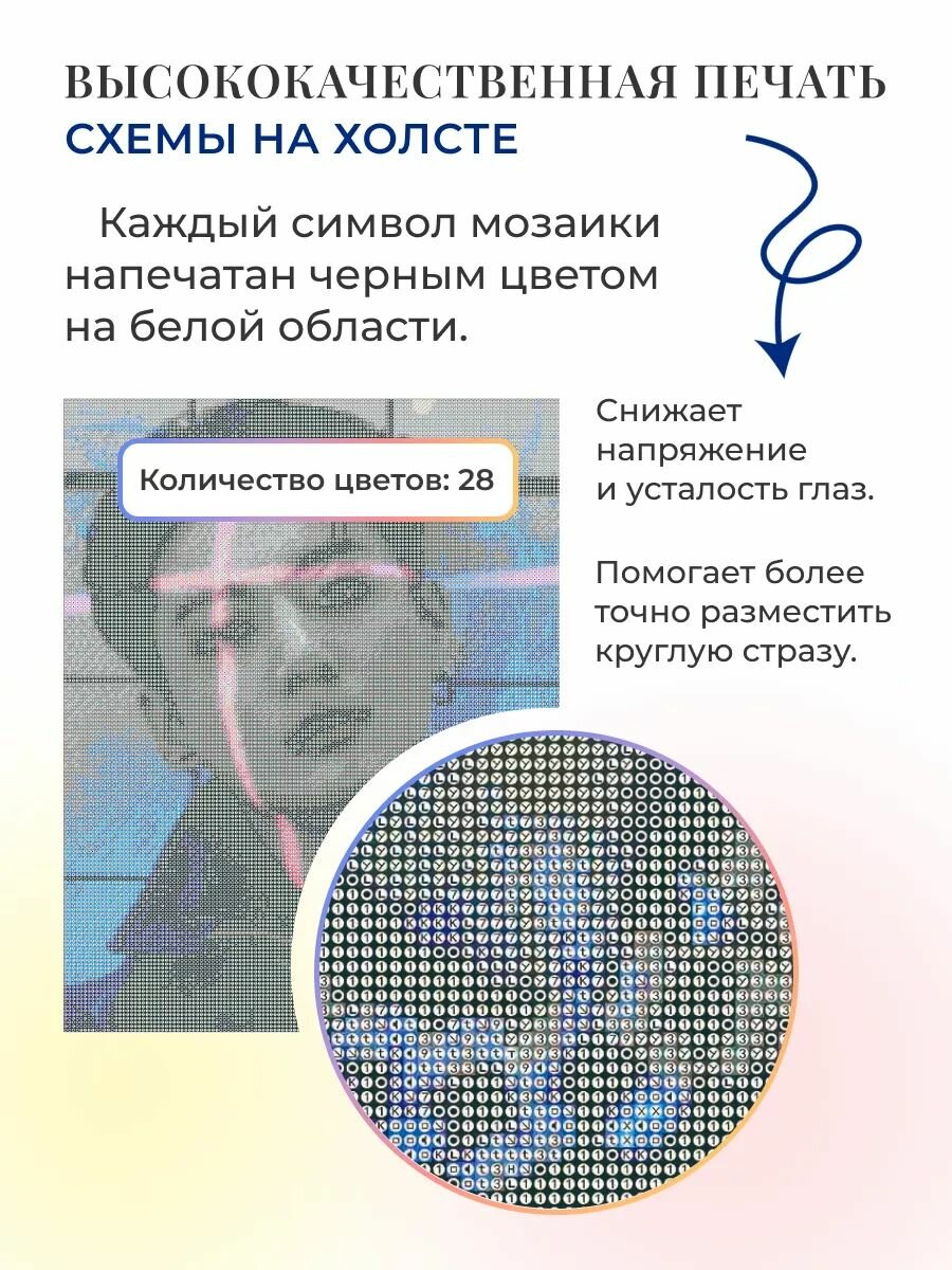 | Дополнительная информация | Стразы нашей алмазной мозаики имеют ювелирную огранку и выполнены по запатентованной технологии с фасетом в 21 грань. Таким образом достигнута уникальная, неповторимая дисперсия, переливы и блеск. Клеевая основа холста— нетоксичный гипоаллергенный сертифицированный клей компании ZDSResin (Швейцария). |