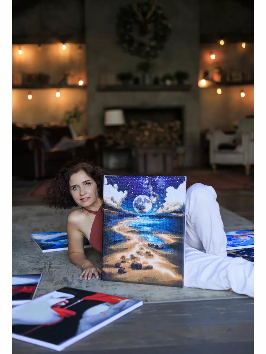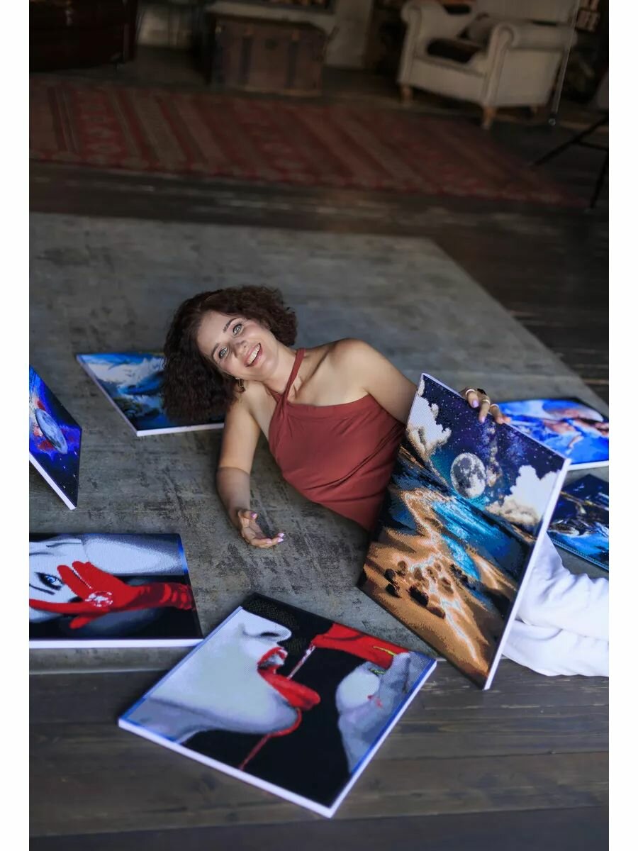 | Подробная комплектация | Холст со схемой и клеевой основой на подрамнике; комплект круглых страз; стилус, лоток для страз, гель для стилуса, доп.насадки для стилуса, zip-пакеты, цветовая карта, крепления |