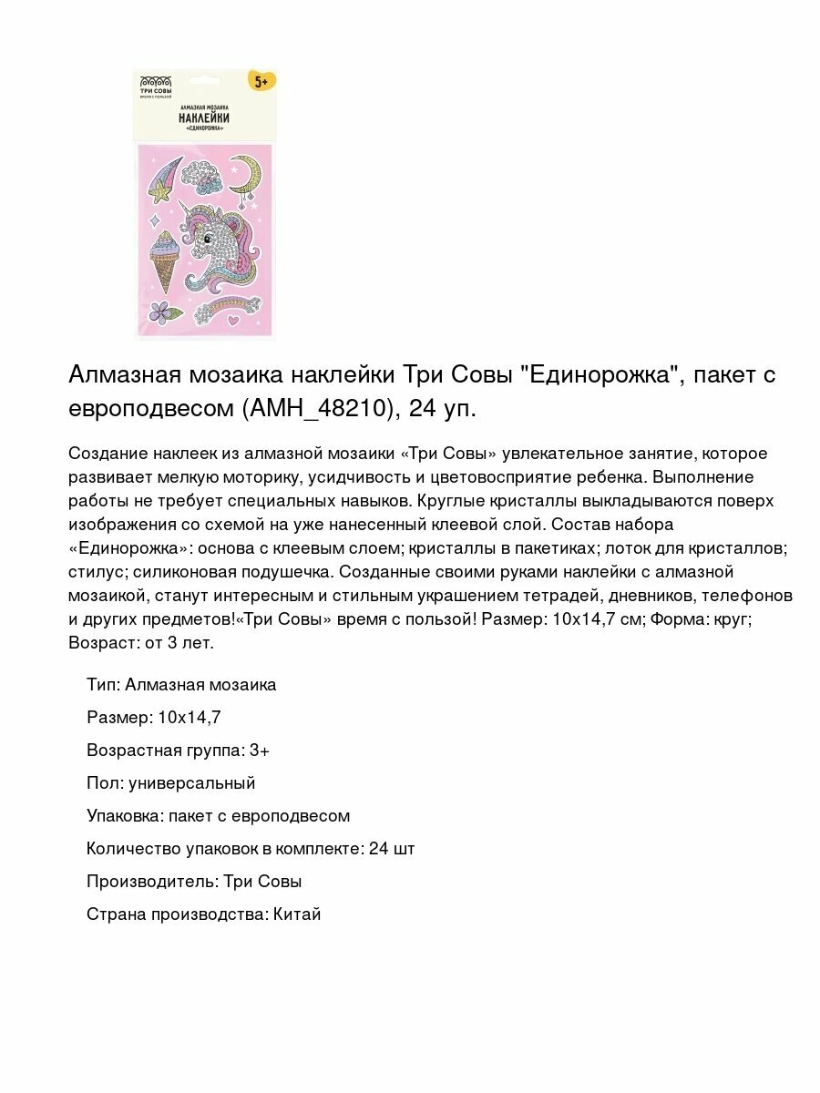 Купить Алмазная мозаика наклейки Три Совы «Единорожка», пакет с европодвесом (АМН_48210), 24 уп. с доставкой по всей России. Алмазная мозаика наклейки Три Совы «Единорожка», пакет с европодвесом (АМН_48210), 24 уп.: сравнение цен, характеристики, фото, актуальное наличие и цены.