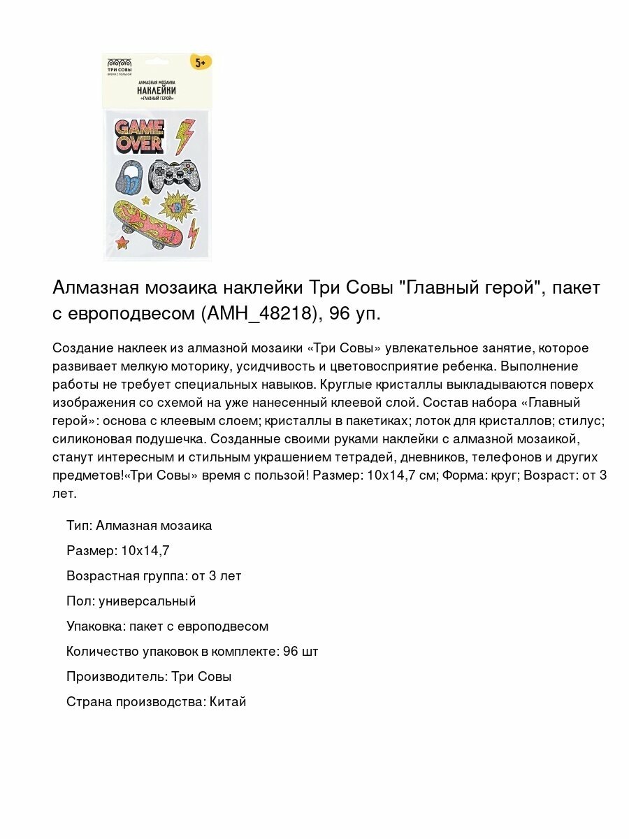 Алмазная мозаика наклейки Три Совы «Главный герой», пакет с европодвесом (АМН_48218), 96 уп.: сравнение цен, характеристики, фото, актуальное наличие и цены.