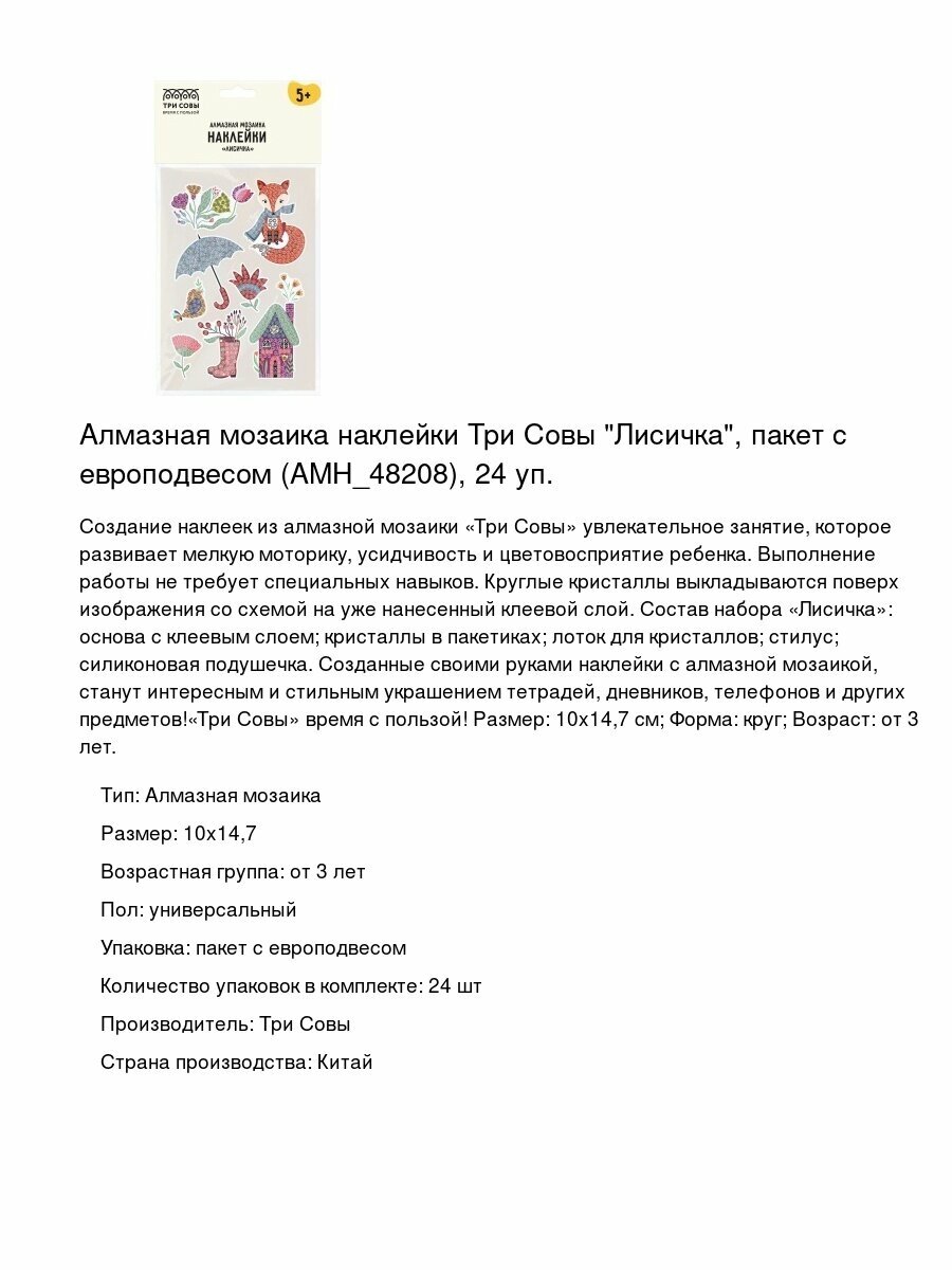 Алмазная мозаика наклейки Три Совы «Лисичка», пакет с европодвесом (АМН_48208), 24 уп.: сравнение цен, характеристики, фото, актуальное наличие и цены.