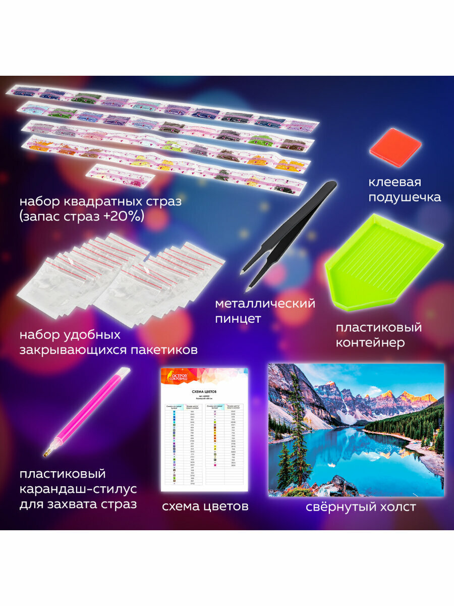 | Особенности | лоток для страз, пинцет, подрамник, стилус, холст, цветная схема, ювелирная огранка |