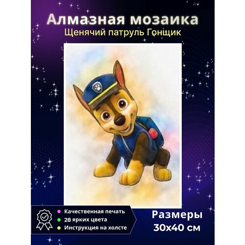 На данной алмазной картине представлен Гонщик - представитель породы немецкая овчарка, лидер всего отряда, часто выполняющий функции командира, полицейского и иногда супершпиона. Как Мега-щенок обладает сверхскоростью. Ездит на синем внедорожнике с номером 02.