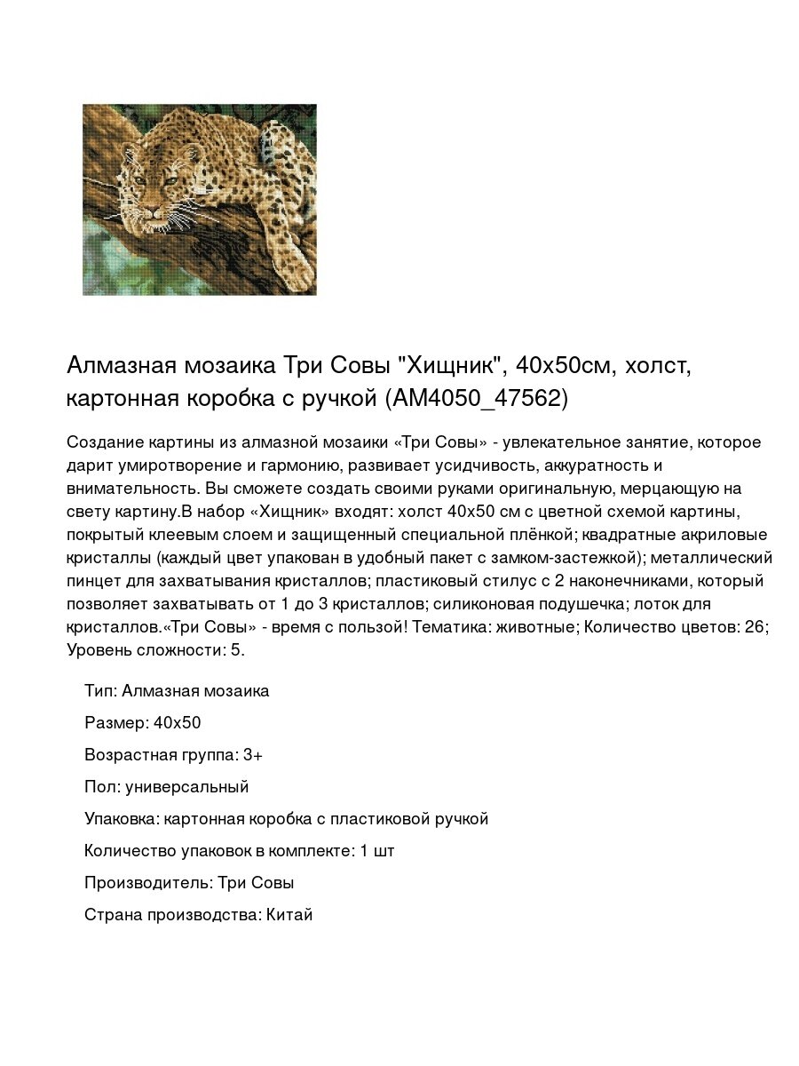 Купить Алмазная мозаика Три Совы «Хищник», 40×50см, холст, картонная коробка с ручкой (АМ4050_47562) с доставкой по всей России. Алмазная мозаика Три Совы «Хищник», 40×50см, холст, картонная коробка с ручкой (АМ4050_47562): сравнение цен, характеристики, фото, актуальное наличие и цены.