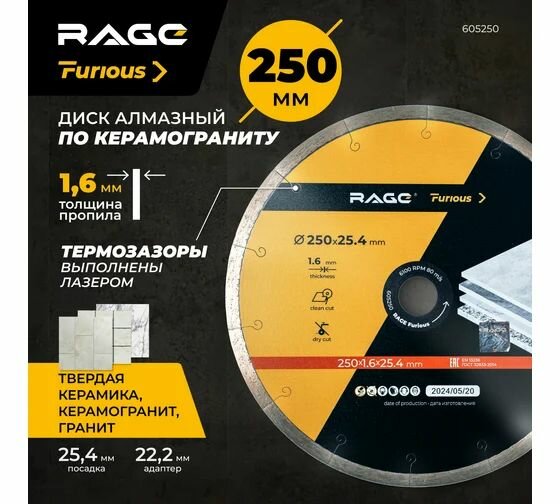 Диск алмазный Furious по керамограниту сплошной HARD CERAMICS 250 мм RAGE 605250: сравнение цен, характеристики, фото, актуальное наличие и цены.