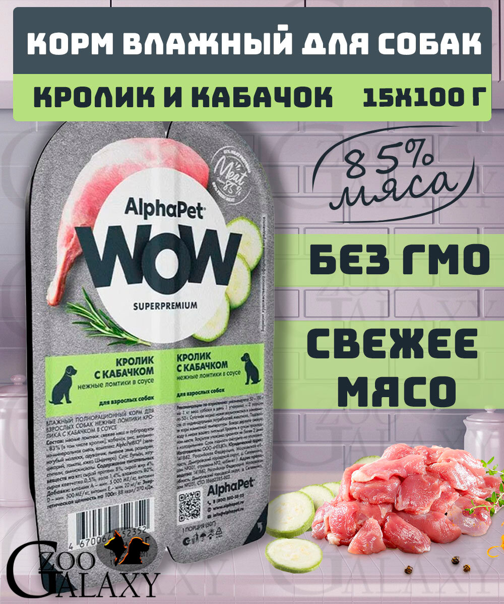 ALPHAPET Корм влажный WOW для собак кролик и кабачок 15х100г: сравнение цен, характеристики, фото, актуальное наличие и цены.