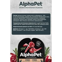 AlphaPet SUPERPREMIUM - суперпремиальное питание на основе натуральных ингредиентов. Линейка питания для животных, владельцы которых хотят быть уверены в лучшем выборе корма для своего питомца. Максимально открытый и понятный состав продукта, приготовленного по инновационной технологии из свежего мяса и с содержанием более чем 90% мясного белка!