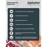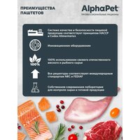 Здоровый и активный питомец – главная задача каждого хозяина. Команда AlphaPet создает и производит полезные корма высшей категории качества Holistiс, давая возможность каждому владельцу быть уверенным в правильном выборе кормления для своего животного. AlphaPet SUPERPREMIUM - супер-премиальное питание на основе натуральных ингредиентов. Линейка питания для животных, владельцы которых хотят быть уверены в лучшем выборе корма для своего питомца. Максимально открытый и понятный состав продукта, приготовленного по инновационной технологии из свежего мяса и с содержанием большого количества мясного белка! Пашеты AlphaPet: Из свежего мяса; Беззерновая рецептура; Ингредиенты качества human grade; Уникальный комплекс AlphaPetBio; Вкусовая привлекательность и поедаемость проверены в собственно центре AlphaPet.