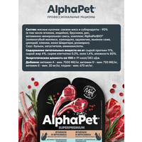Здоровый и активный питомец – главная задача каждого хозяина. Команда AlphaPet® создает и производит полезные корма высшей категории качества Holistiс, давая возможность каждому владельцу быть уверенным в правильном выборе кормления для своего животного. ¶AlphaPet® SUPERPREMIUM - суперпремиальное питание на основе натуральных ингредиентов. Линейка питания для животных, владельцы которых хотят быть уверены в лучшем выборе корма для своего питомца. Максимально открытый и понятный состав продукта, приготовленного по инновационной технологии из свежего мяса и с содержанием более чем 90% мясного белка!¶Линейка влажных кормов AlphaPet так же содержит:¶Ингредиенты качества Human Graid¶Уникальный комплекс AlphaPetBio ¶Рис - для чувствительного пищеварения¶*Не содержит ГМО искусственных красителей, ароматизаторов, консервантов, пшеницу, кукурузу и глютен.