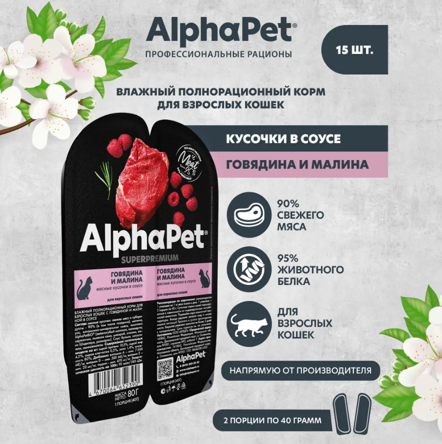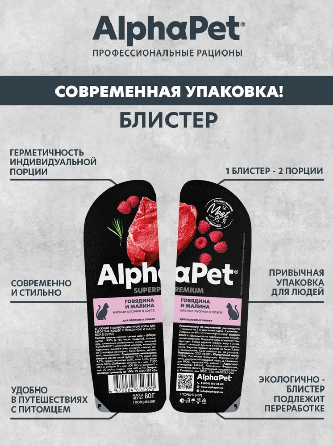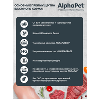 Здоровый и активный питомец – главная задача каждого хозяина. Команда AlphaPet® создает и производит полезные корма высшей категории качества Holistiс, давая возможность каждому владельцу быть уверенным в правильном выборе кормления для своего животного. AlphaPet® SUPERPREMIUM - суперпремиальное питание на основе натуральных ингредиентов. Линейка питания для животных, владельцы которых хотят быть уверены в лучшем выборе корма для своего питомца. Максимально открытый и понятный состав продукта, приготовленного по инновационной технологии из свежего мяса и с содержанием более чем 90% мясного белка! Линейка влажных кормов AlphaPet так же содержит: Ингредиенты качества Human Graid Уникальный комплекс AlphaPetBio Рис - для чувствительного пищеварения *Не содержит ГМО искусственных красителей, ароматизаторов, консервантов, пшеницу, кукурузу и глютен.