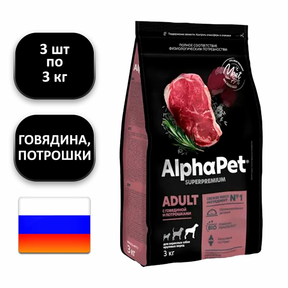Купить ALPHAPET SUPERPREMIUM сухой корм для взрослых собак крупных пород с говядиной и потрошками 3кг х 3 шт с доставкой по всей России.