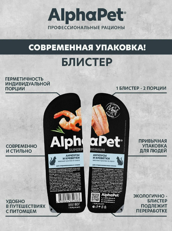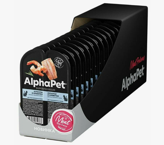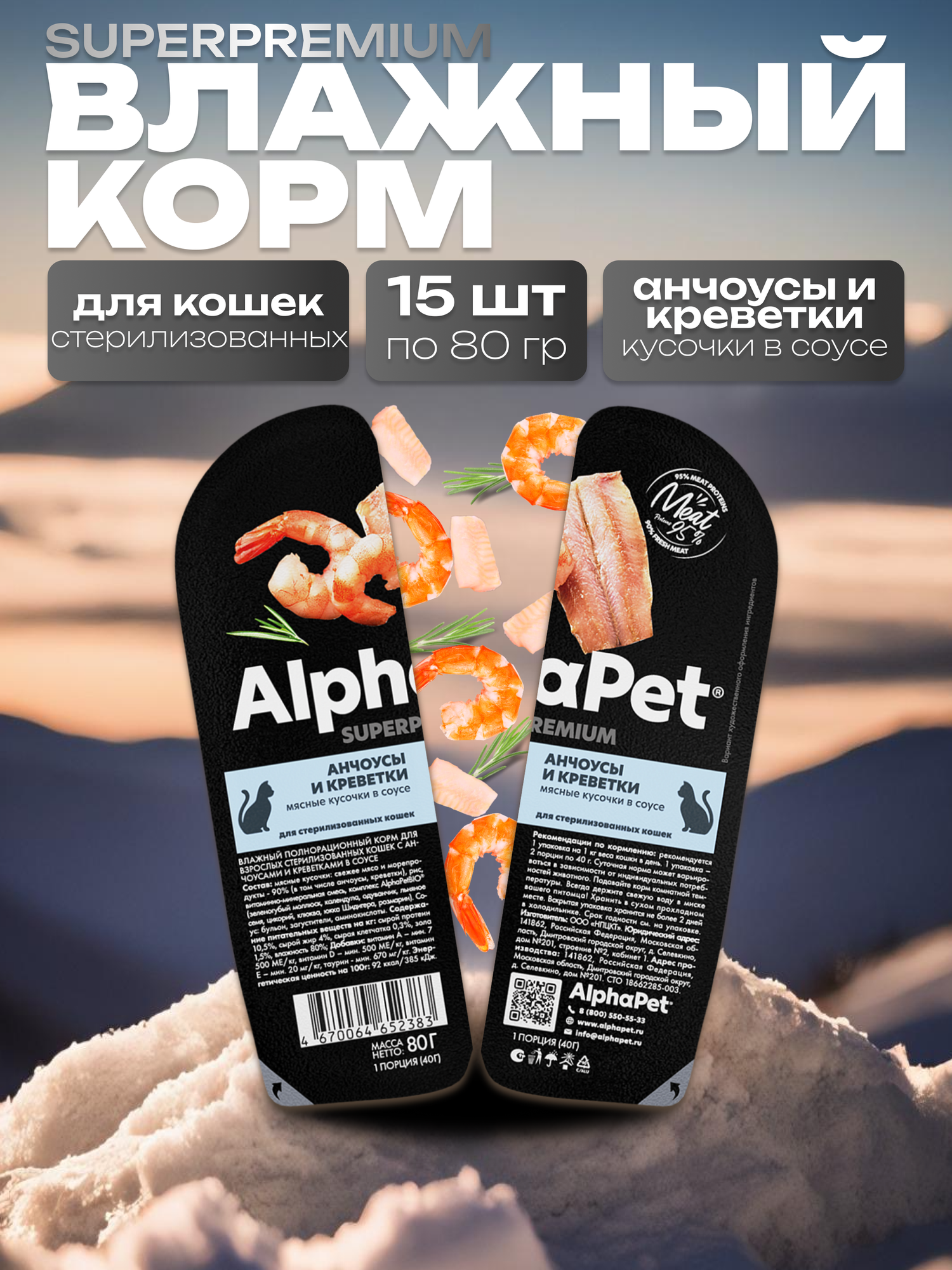 AlphaPet SuperPremium влажный корм для стерилизованных кошек, анчоусы и креветки, мясные кусочки в соусе (15шт в уп): сравнение цен, характеристики, фото, актуальное наличие и цены.