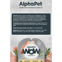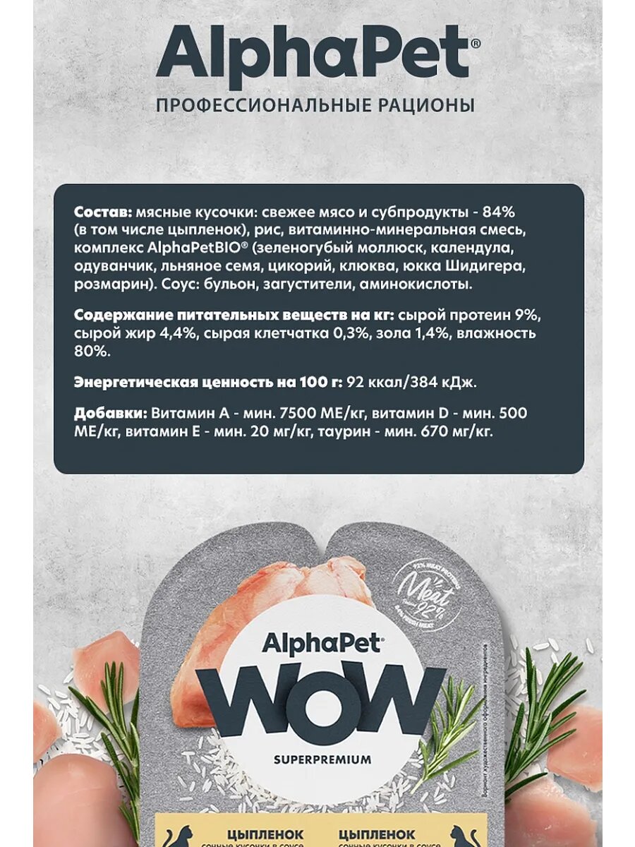 "Здоровый и активный питомец – главная задача каждого хозяина. Команда AlphaPet® создает и производит полезные корма высшей категории качества Holistiс, давая возможность каждому владельцу быть уверенным в правильном выборе кормления для своего животного. AlphaPet® WOW - линейка качественного питания по доступной цене для животных, владельцы которых хотят быть уверены в выборе лучшего качества рациона по разумной цене. Максимально открытый и понятный состав кормов, приготовленных по инновационной технологии из свежего мяса и с содержанием более чем 90% мясного белка! Линейка влажных кормов AlphaPet так же содержит: Ингредиенты качества Human Graid Уникальный комплекс AlphaPetBio Рис - для чувствительного пищеварения *Не содержит ГМО искусственных красителей, ароматизаторов, консервантов, пшеницу, кукурузу и глютен. " Мясные кусочки: свежее мясо и субпродукты - 84% (в том числе цыпленок), рис, витаминно-минеральная смесь, комплекс AlphaPetBIO® (зеленогубый моллюск, календула, одуванчик, льняное семя, цикорий, клюква, юкка Шидигера, розмарин). Соус: бульон, загустители, аминокислоты. Витамин А - мин. 7500 МЕ/кг, витамин D - мин. 500 МЕ/кг, витамин Е - мин. 20 мг/кг, таурин - мин. 670 мг/кг. Рекомендации по кормлению: рекомендуется 1 упаковка на 1 кг веса кошки в день. 1 упаковка - 2 порции по 40 г. Суточная норма может варьироваться в зависимости от индивидуальных потребностей животного. Подавайте корм комнатной температуры. Всегда держите свежую воду в миске вашего питомца! Хранить в темном прохладном месте.
