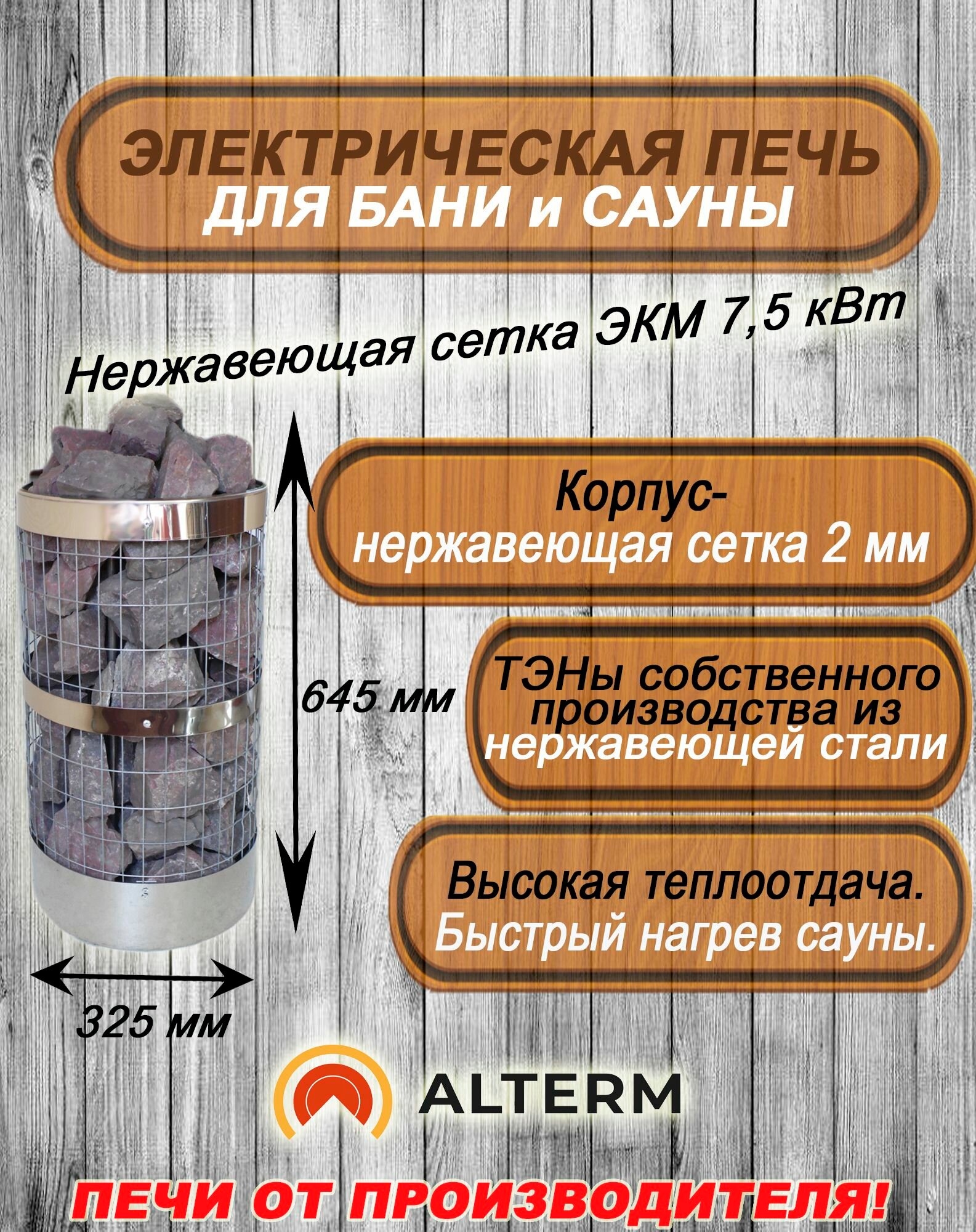 Купить ALTERM Печь для бани и сауны (электрокаменка) ЭКМ-7,5кВт 380 Нержавеющая сетка с доставкой по всей России.