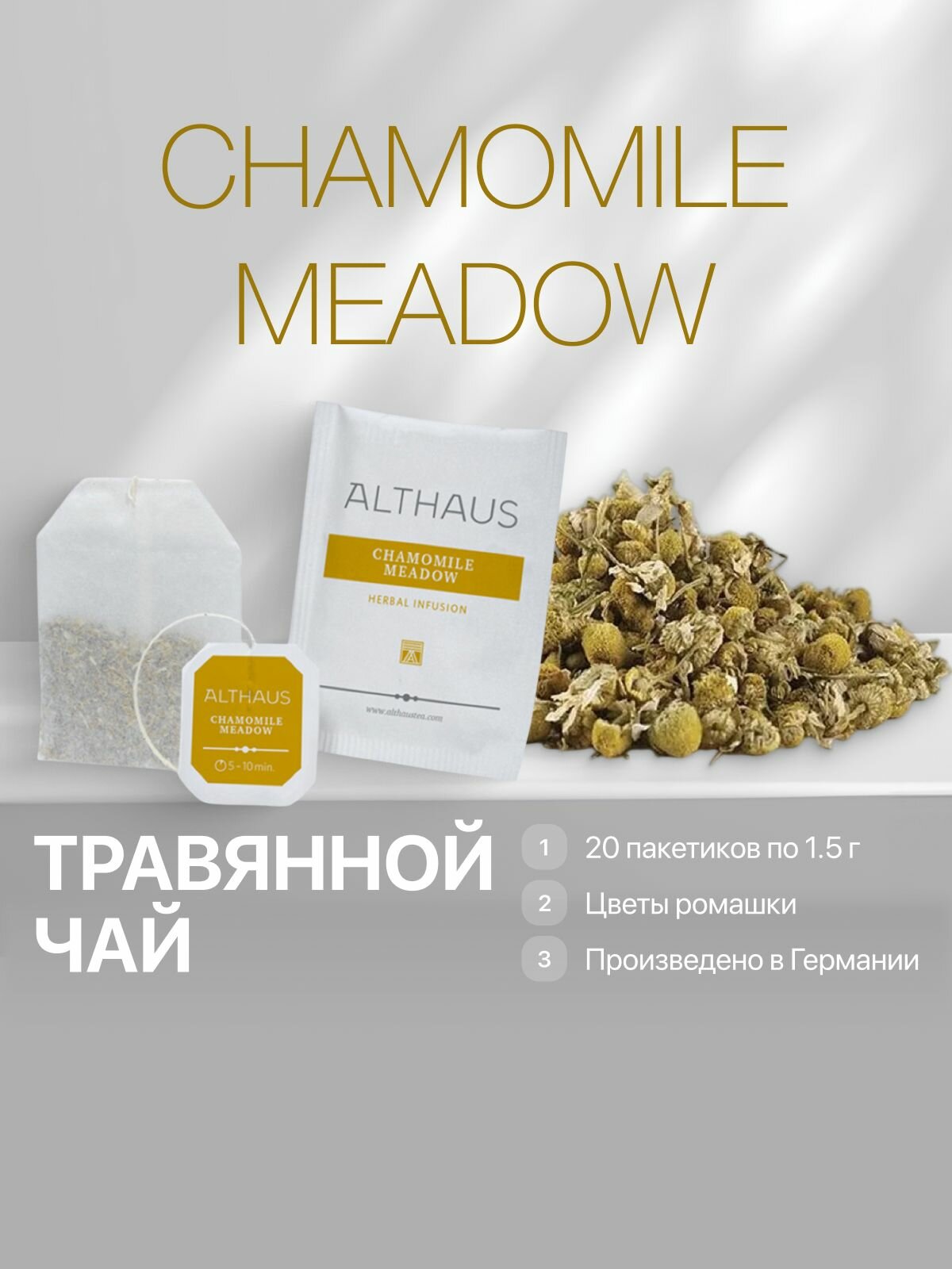 Купить Althaus Chamomile Meadow напиток чайный ромашковый в пакетиках 20 х1,5 г с доставкой по всей России. Althaus Chamomile Meadow напиток чайный ромашковый в пакетиках 20 х1,5 г: сравнение цен, характеристики, фото, актуальное наличие и цены.