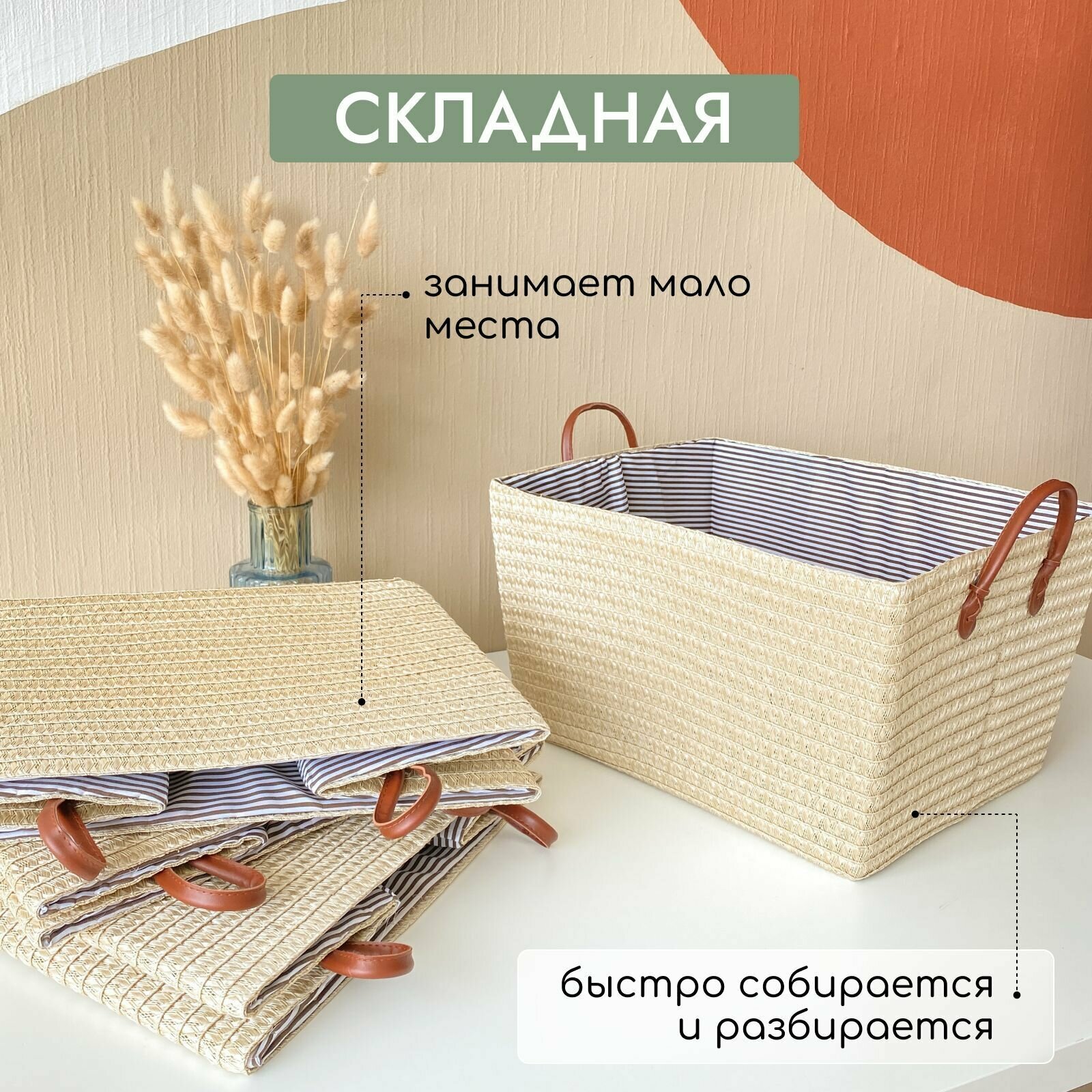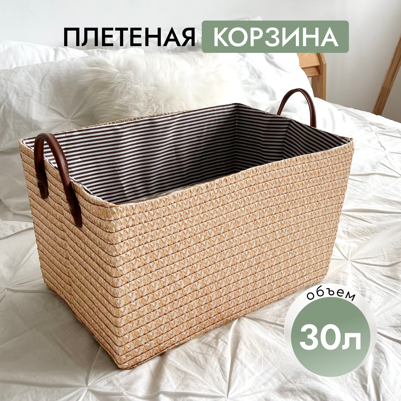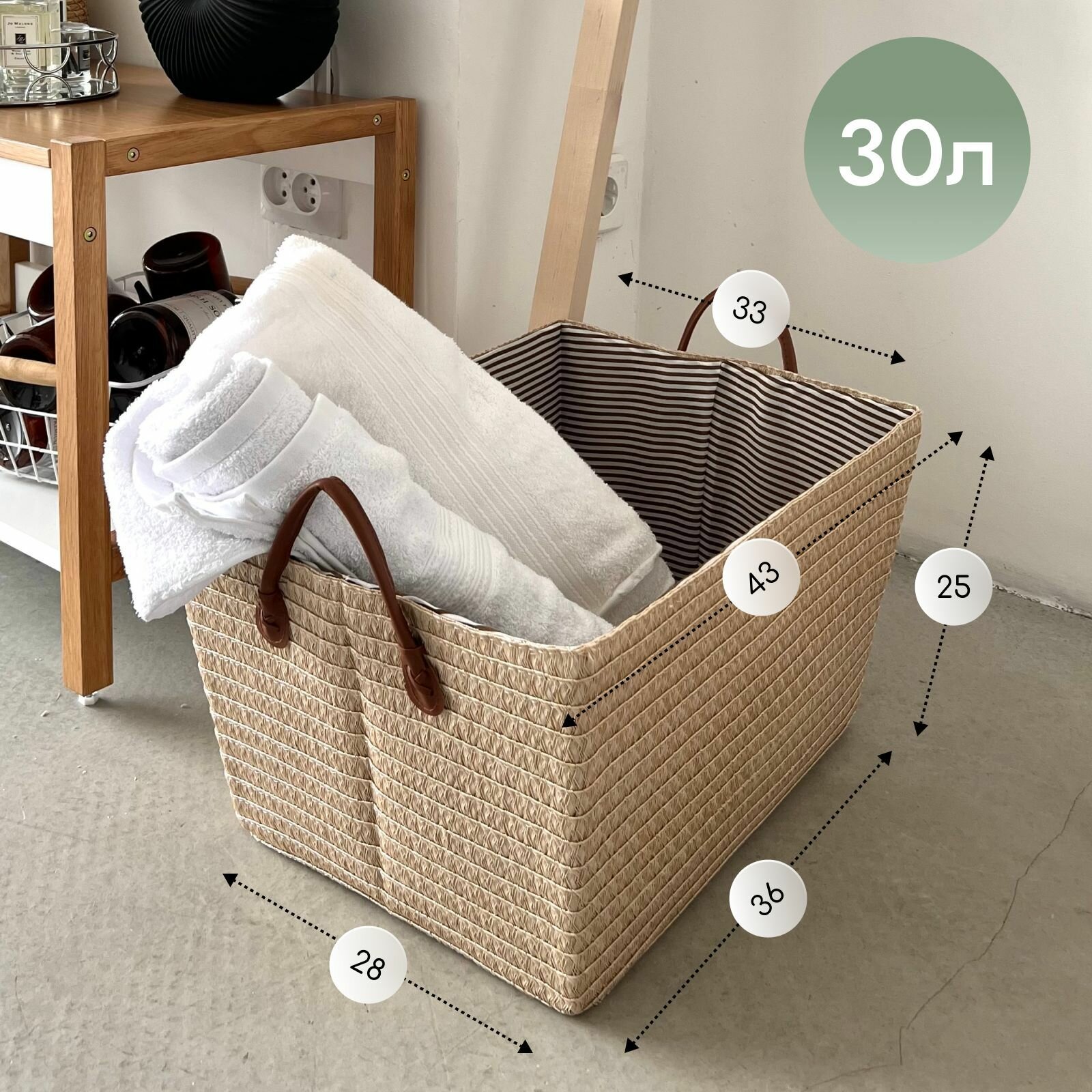 Универсальная корзина объемом 30 литров. Высотой 25 см, шириной вверху 33 см и внизу 28 см, длиной вверху 42 см и внизу 38 см, тем самым имеет трапециевидную форму. Короб для хранения станет отличным приобретением для ванной, прихожей, спальни или детской комнаты. Плетеная корзинка с ручками станет незаменимым атрибутом для хранения полотенец, грязного белья в ванной, для вещей в прихожей и компактного хранения бытовой химии.