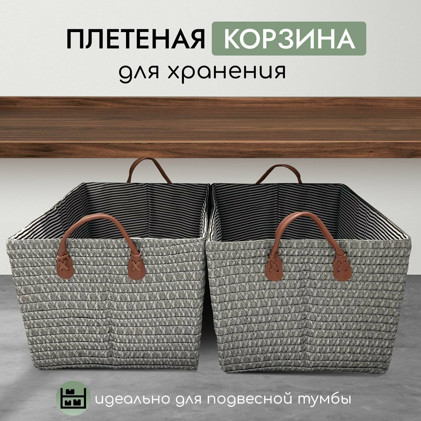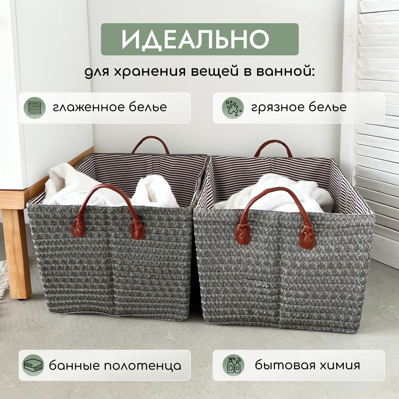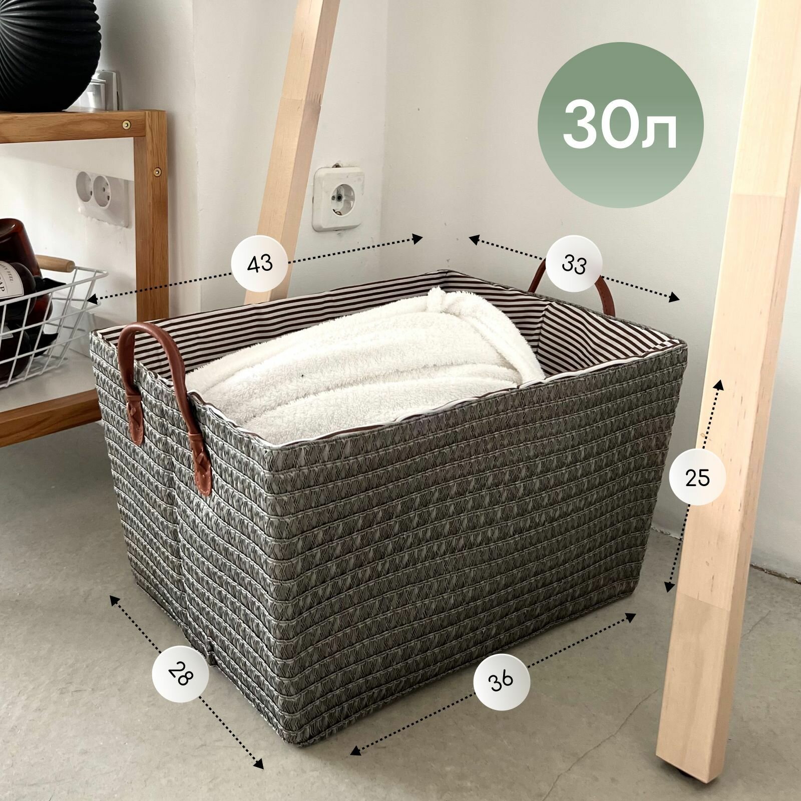 Универсальная корзина объемом 30 литров. Высотой 25 см, шириной вверху 33 см и внизу 28 см, длиной вверху 42 см и внизу 38 см, тем самым имеет трапециевидную форму. Короб для хранения станет отличным приобретением для ванной, прихожей, спальни или детской комнаты. Плетеная корзинка с ручками станет незаменимым атрибутом для хранения полотенец, грязного белья в ванной, для вещей в прихожей и компактного хранения бытовой химии.