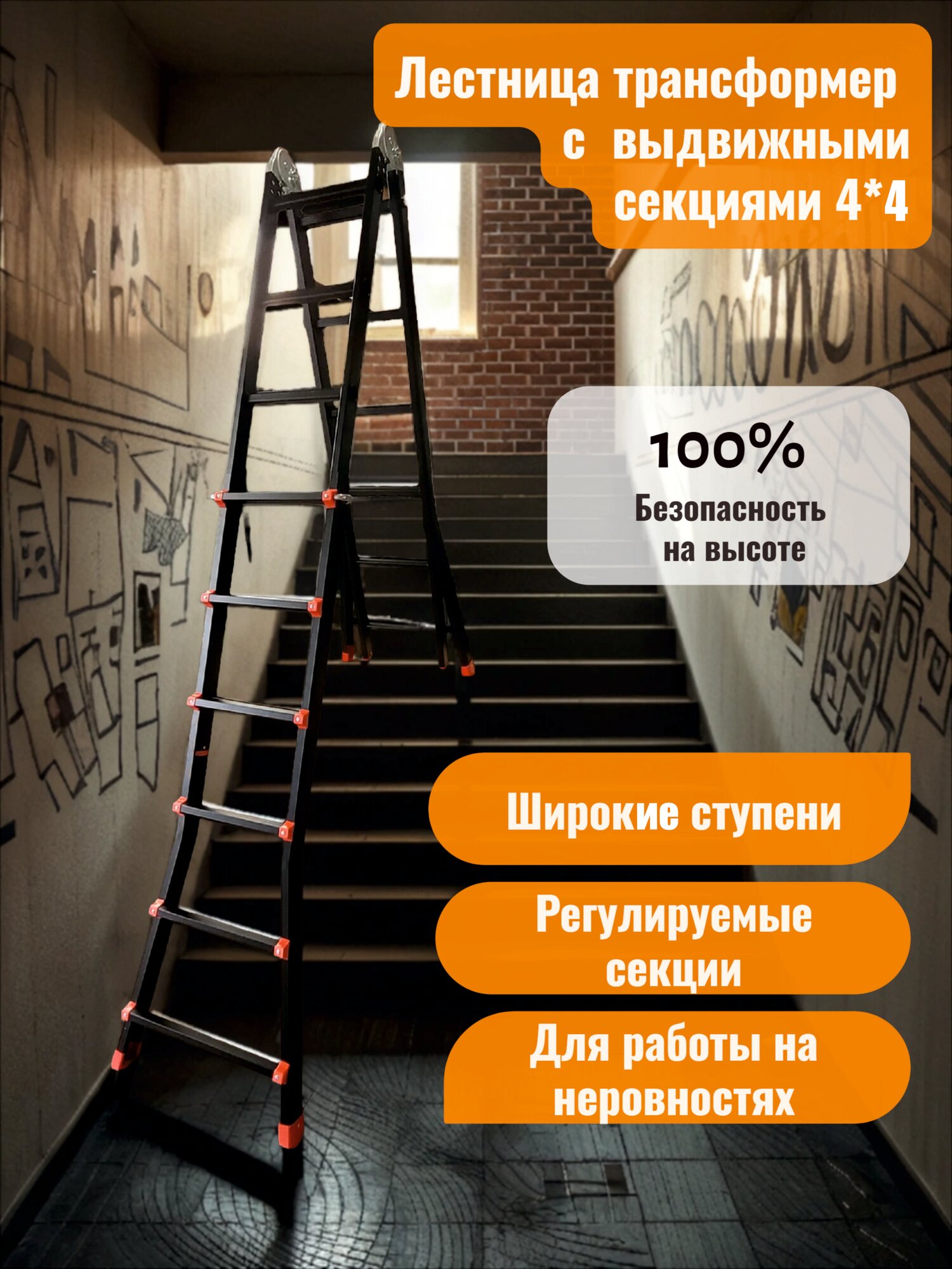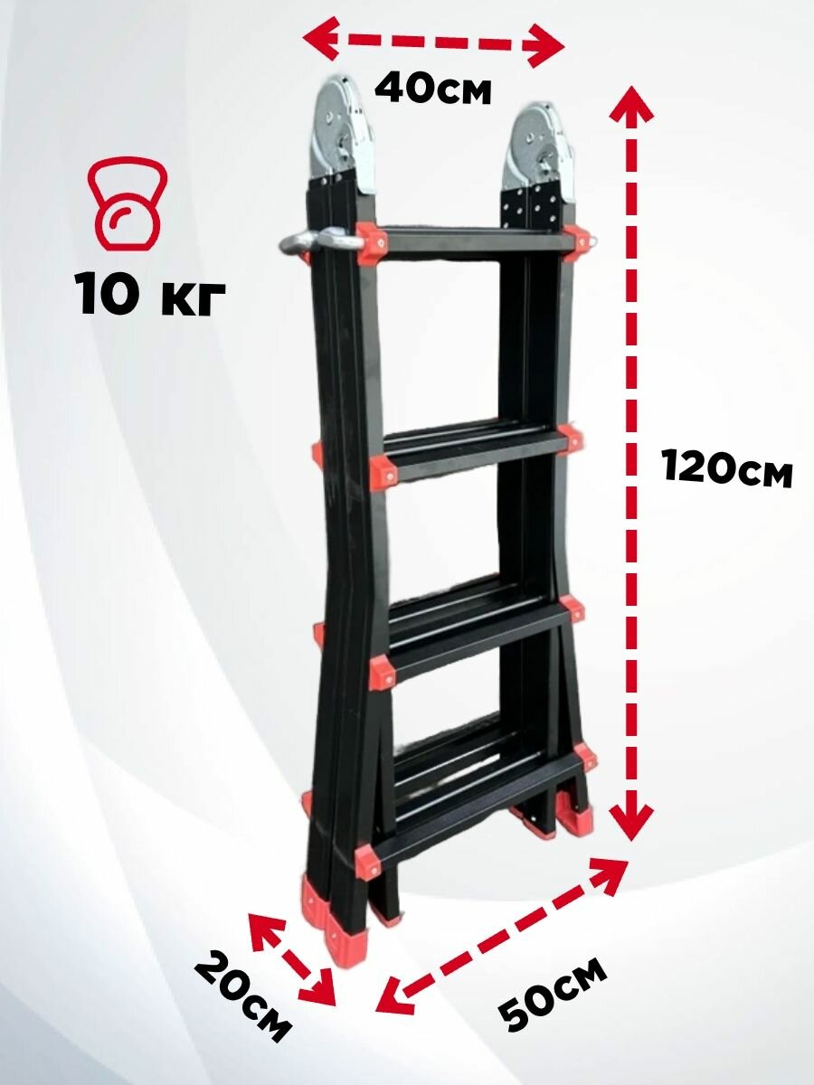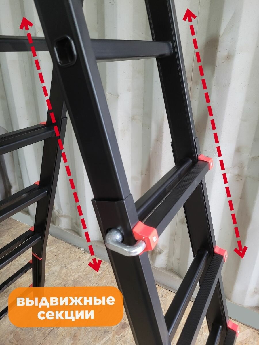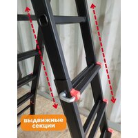 Алюминиевая лестница трансформер 4 секции (2 из них выдвижные) по 4 ступени. Раскладывается в положениях лестницы и стремянки.