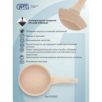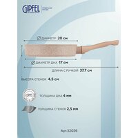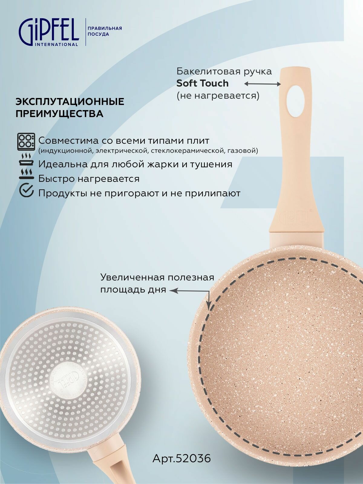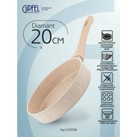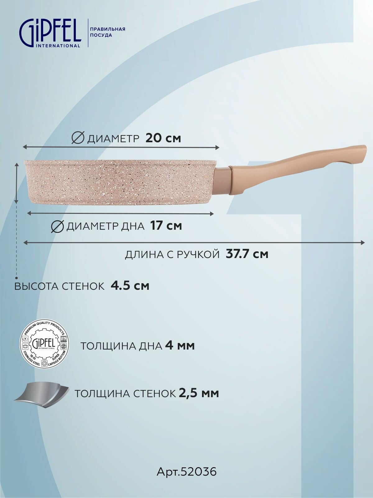 Алюминиевая сковорода Gipfel Diamant 52036 20x4,6 см. Изготовлена из кованого алюминия, из которого получаются прочные и легкие сковороды с тонкими стенками и толстым дном. Двухслойное антипригарное покрытие Pfluon Premium облегчает приготовление любых продуктов (мяса, рыбы, яиц, овощей), легко выдерживает интенсивную эксплуатацию. Благодаря устойчивости к царапинам, покрытие допускает использование металлических аксессуаров. Для заботящихся о здоровье неоспоримым достоинством будет экологичность данного покрытия, так как оно не содержит перфтороктановой кислоты. Сковорода выполнена в лаконичном дизайне бежевого цвета и бакелитовой ручкой с покрытием Soft Touch (удобно держать и не скользит в руке). Толщина дна: 4,0 мм, толщина стенок: 2,5 мм. Сковорода диаметром 20 см идеально подходит для приготовления завтрака (яичницы, омлета), ее быстро и удобно мыть.