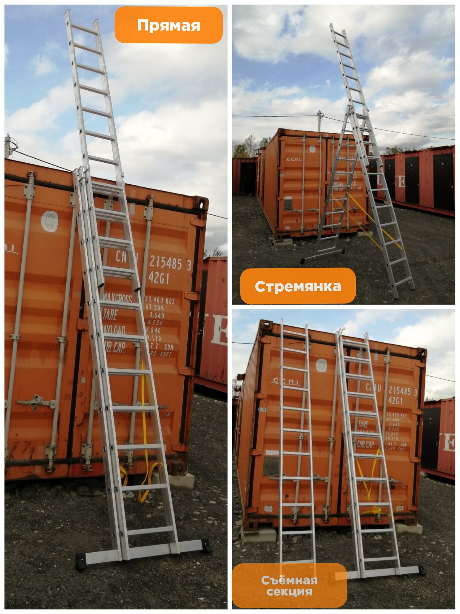 Алюминиевая выдвижная лестница 3 секции по 11 ступеней. Усиленная серия лестниц Комбат. Раскладывается в положениях лестницы и стремянки. Третья секция съёмная, её можно использовать как отдельную лестницу.