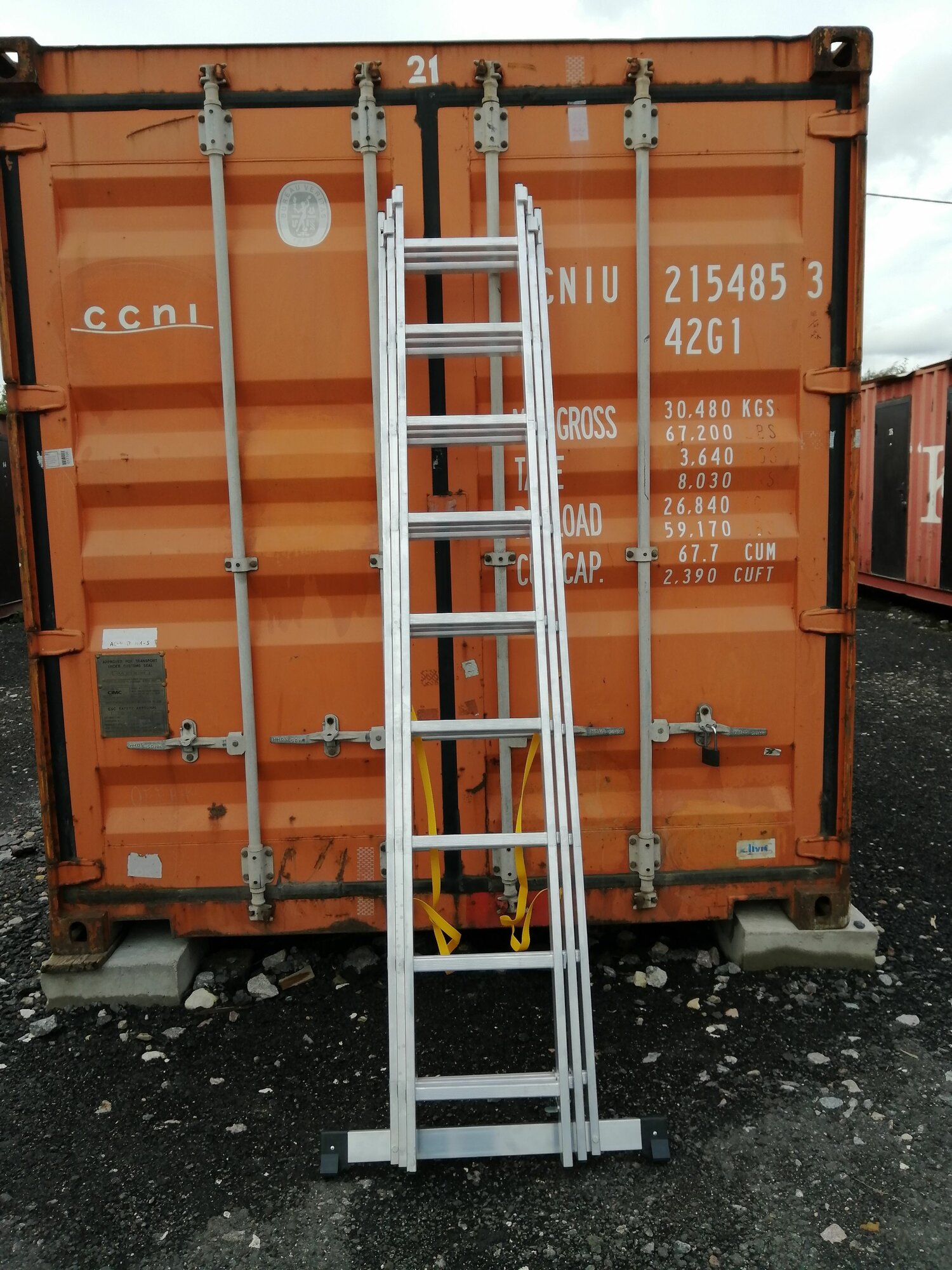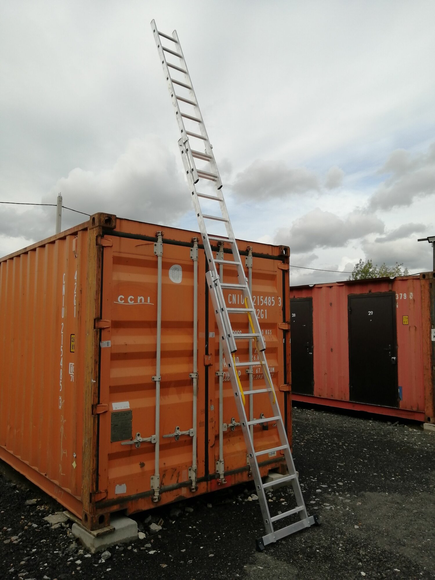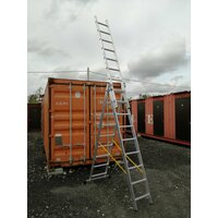 Алюминиевая выдвижная лестница 3 секции по 9 ступеней. Усиленная серия лестниц Комбат. Раскладывается в положениях лестницы и стремянки. Третья секция съёмная, её можно использовать как отдельную лестницу.