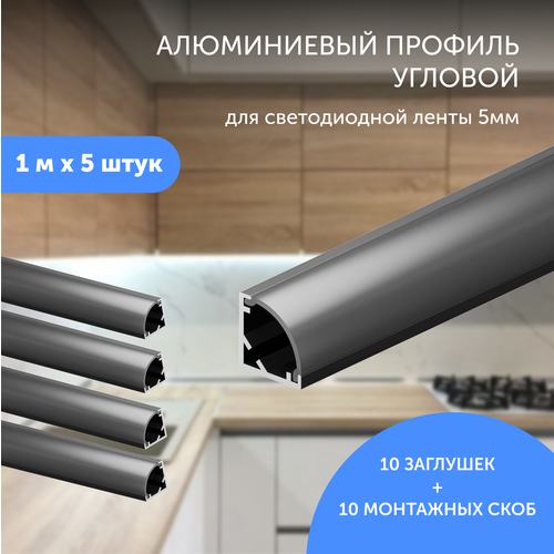Решение представлено комплектом накладного углового профиля для светодиодной ленты длиной 1м. черного цвета с двумя заглушками, монтажными скобами, служащими крепежом, и рассеивателем в количестве пяти штук. Это самый узкий алюминиевый профиль, который уместно вписывается в любое интерьерное решение и обладает высокими теплопроводящими свойствами, рассеивающими тепло по корпусу светодиодной ленты, защищая ее от перегрева и продлевая срок ее службы. L образная форма данного профиля подходит для лент освещения шириной 5 мм. Рассеиватель из поликарбоната делает свечение равномерным и не желтеет. Металлический материал легко поддается пилению, что позволяет собирать конструкции, например 2.5 метра. В сборе данная защитная конструкция имеет длину 5 метров. Данный набор комплектующих для светодиодной ленты подходит для подсветки как кухонь, так и прочих помещений. Обратите внимание, что помимо данного цвета и формы в нашем магазине представлен белый профиль и образцы другой формы.