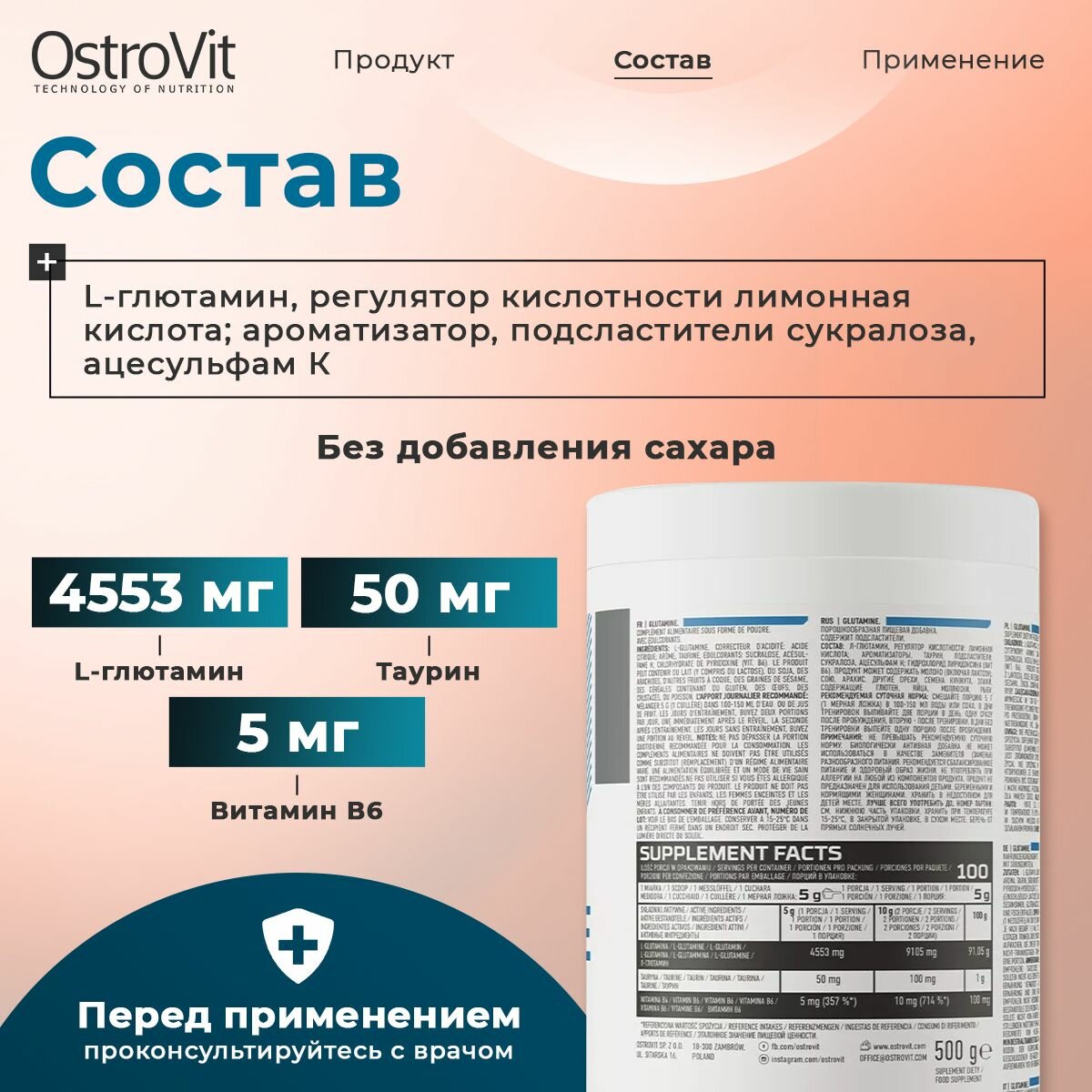 Это спортивная пищевая добавка, являющаяся источником высококачественного L-глютамина. Продукт также содержит ценное вещество таурин. L-глютамина представляет собой аминокислоту, поддерживающую синтез белка и баланс азота в организме.