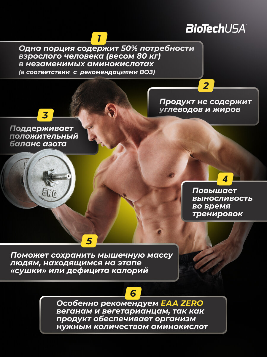 Как и все продукты BioTechUSA, EAA Zero разработан с оптимальным составом. Поэтому EAA Zero содержит все незаменимые аминокислоты в оптимальном соотношении, рекомендованном Всемирной организацией здравоохранения. При обновлении EAA Zero мы не только стремились получить правильные пропорции, но и также поставили своей целью создать комплексный продукт. В результате теперь продукт содержит все незаменимые аминокислоты, а за счет добавления глутамина мы дополнительно увеличили количество аминокислот, необходимых для наращивания мышц.