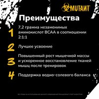 Покупая Mutant ВСАА 9.7 с электролитами, вы получаете не только качественный продукт, но и гарантию его эффективности. Комплектация включает в себя 30 порций порошка, каждая из которых содержит 348 граммов спортивного товара.