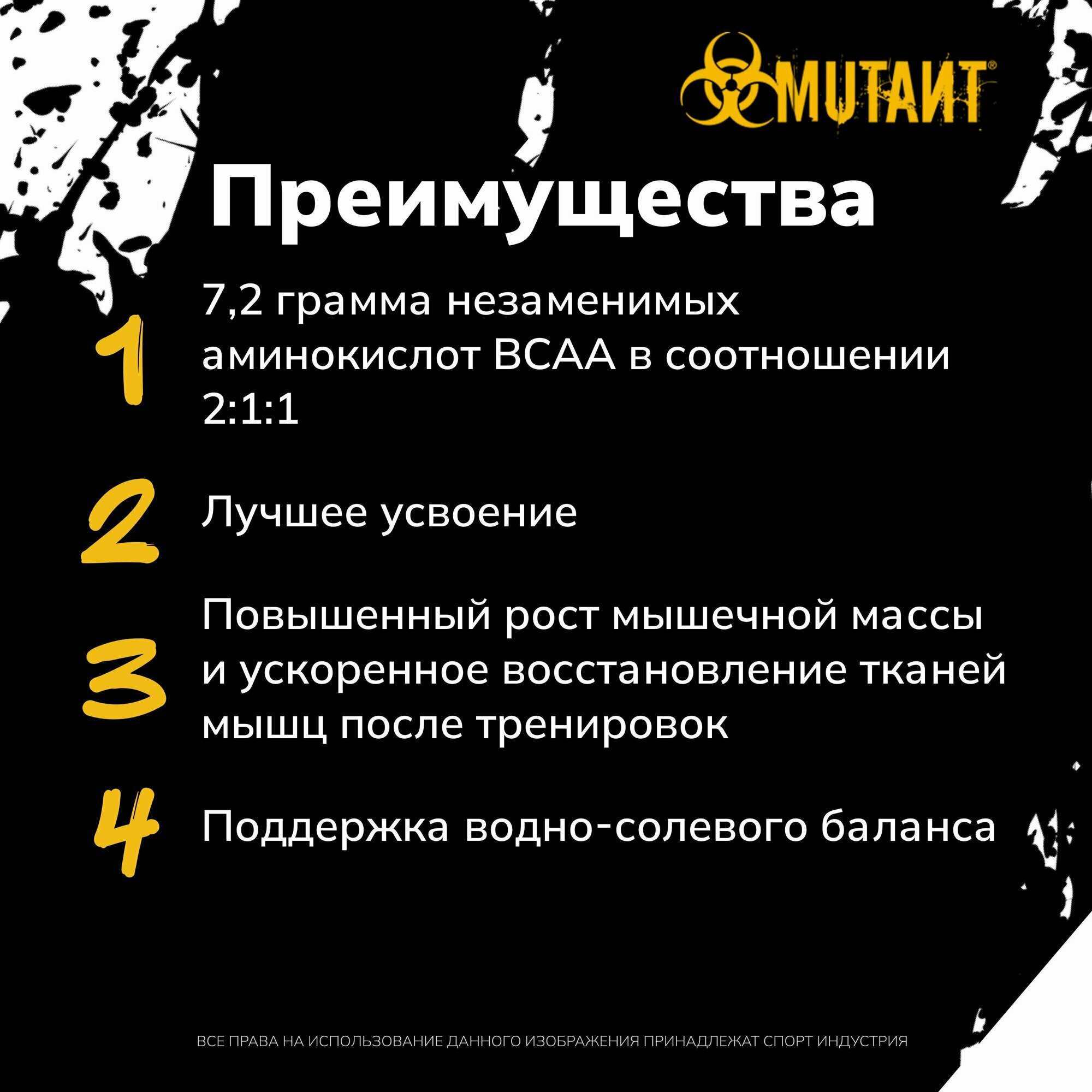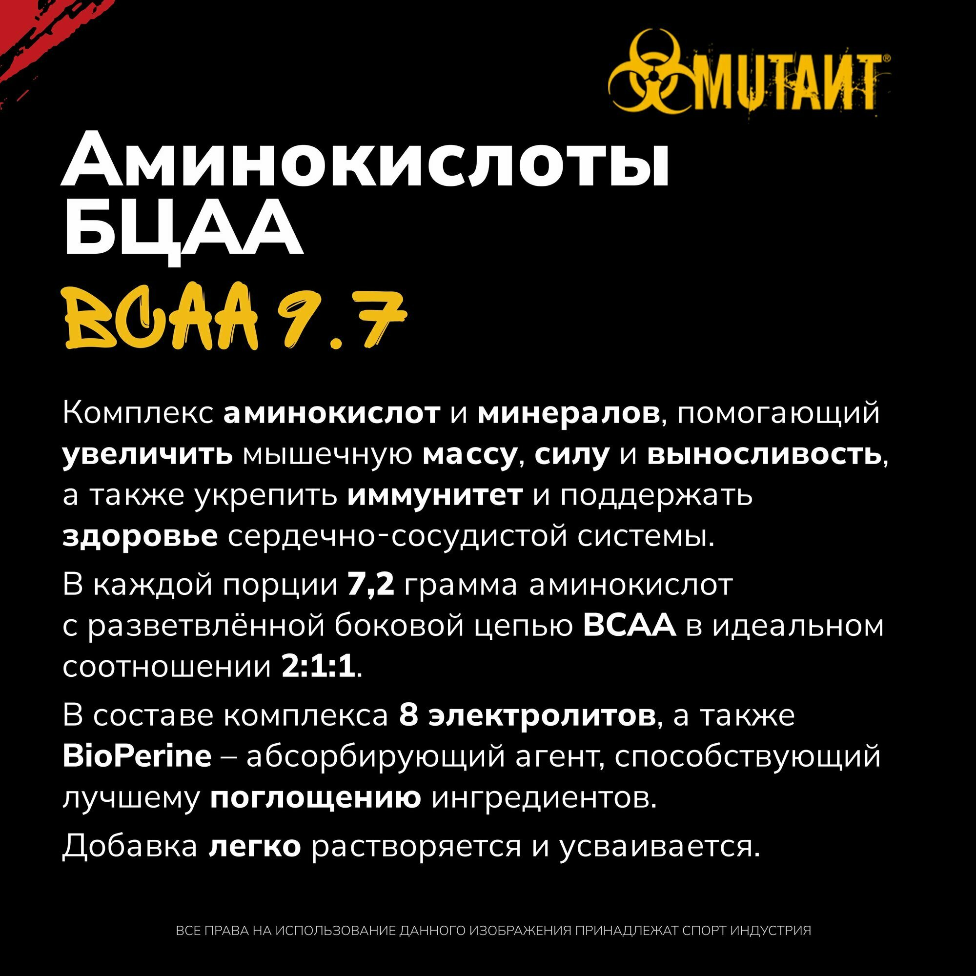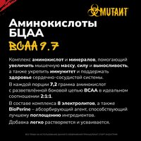 Mutant ВСАА 9.7 содержит в себе такие важные компоненты, как BCAA, глютамин, аргинин, таурин и другие аминокислоты, которые помогают улучшить общее состояние организма и повысить эффективность тренировок. Этот товар также содержит электролиты, которые помогают поддерживать баланс воды и минералов в организме.