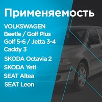 - **VW**: BEETLE (5C1, 5C2), BEETLE Convertible (5C7, 5C8), CADDY III Box (2KA, 2KH, 2CA, 2CH), CADDY III Variant (2KB, 2KJ, 2CB, 2CJ), GOLF PLUS (5M1, 521), GOLF V (1K1), GOLF V Variant (1K5), GOLF VI (5K1), GOLF VI Convertible (517), GOLF VI Variant (AJ5), JETTA III (1K2), JETTA IV (162, 163).