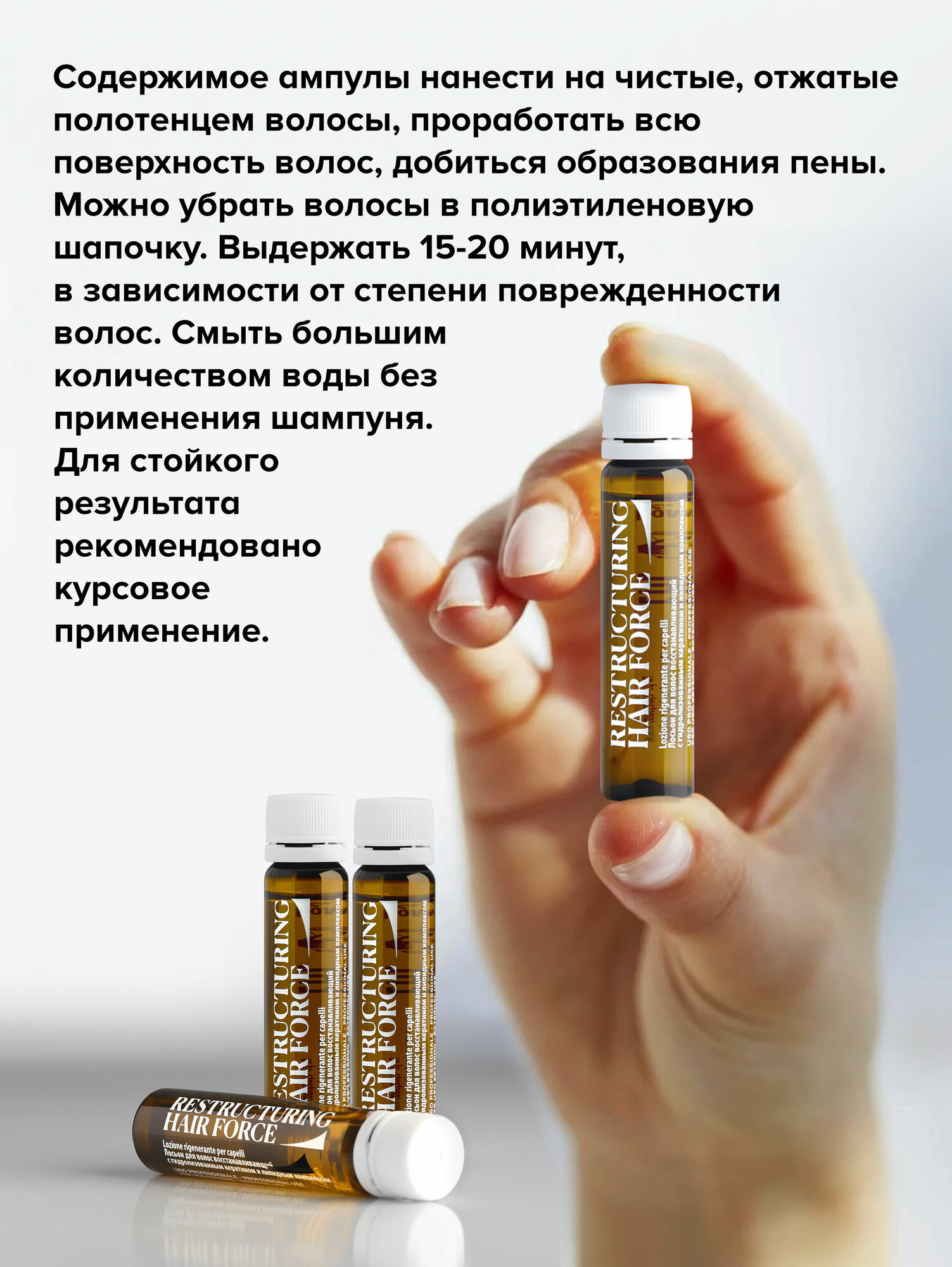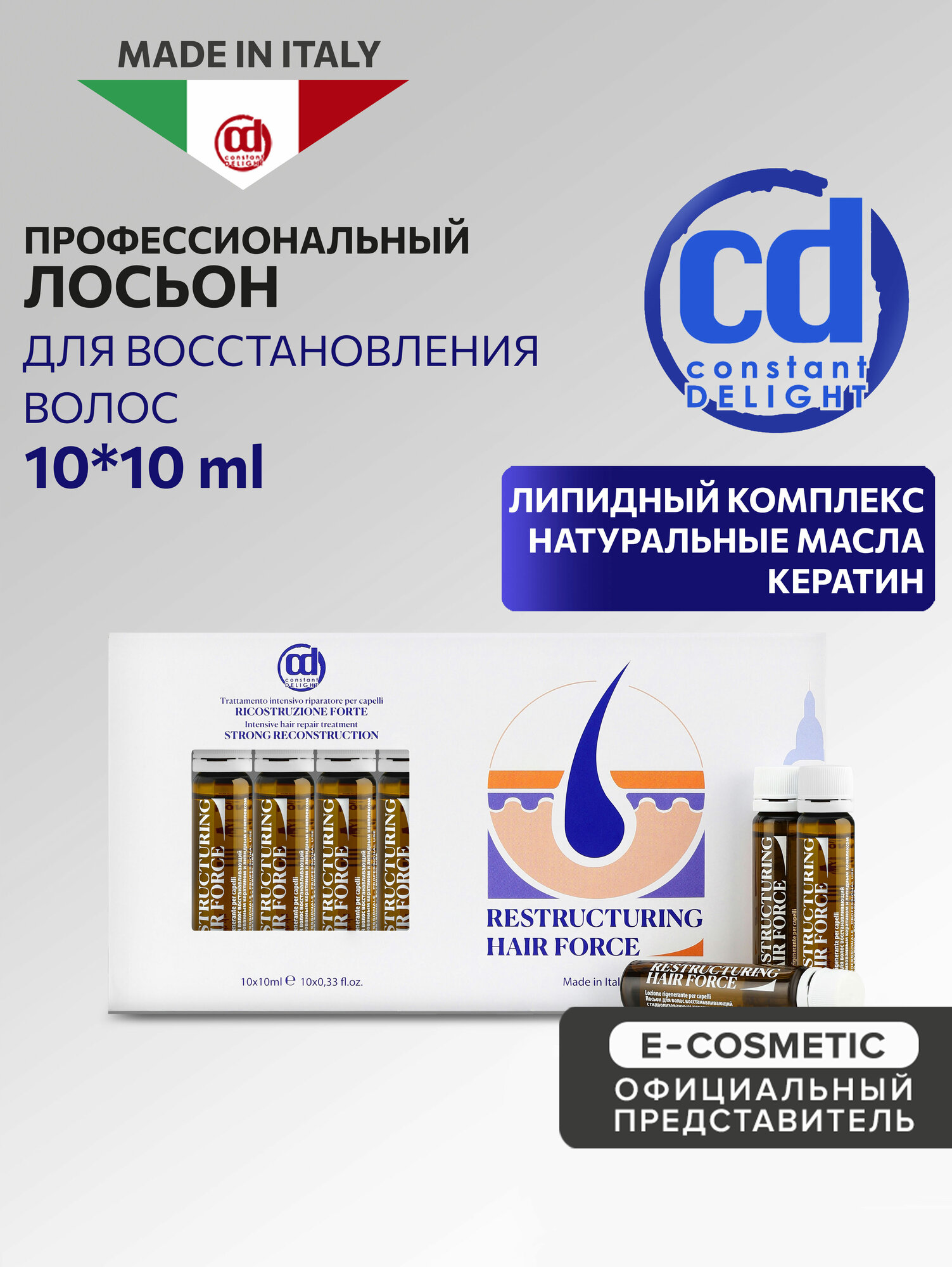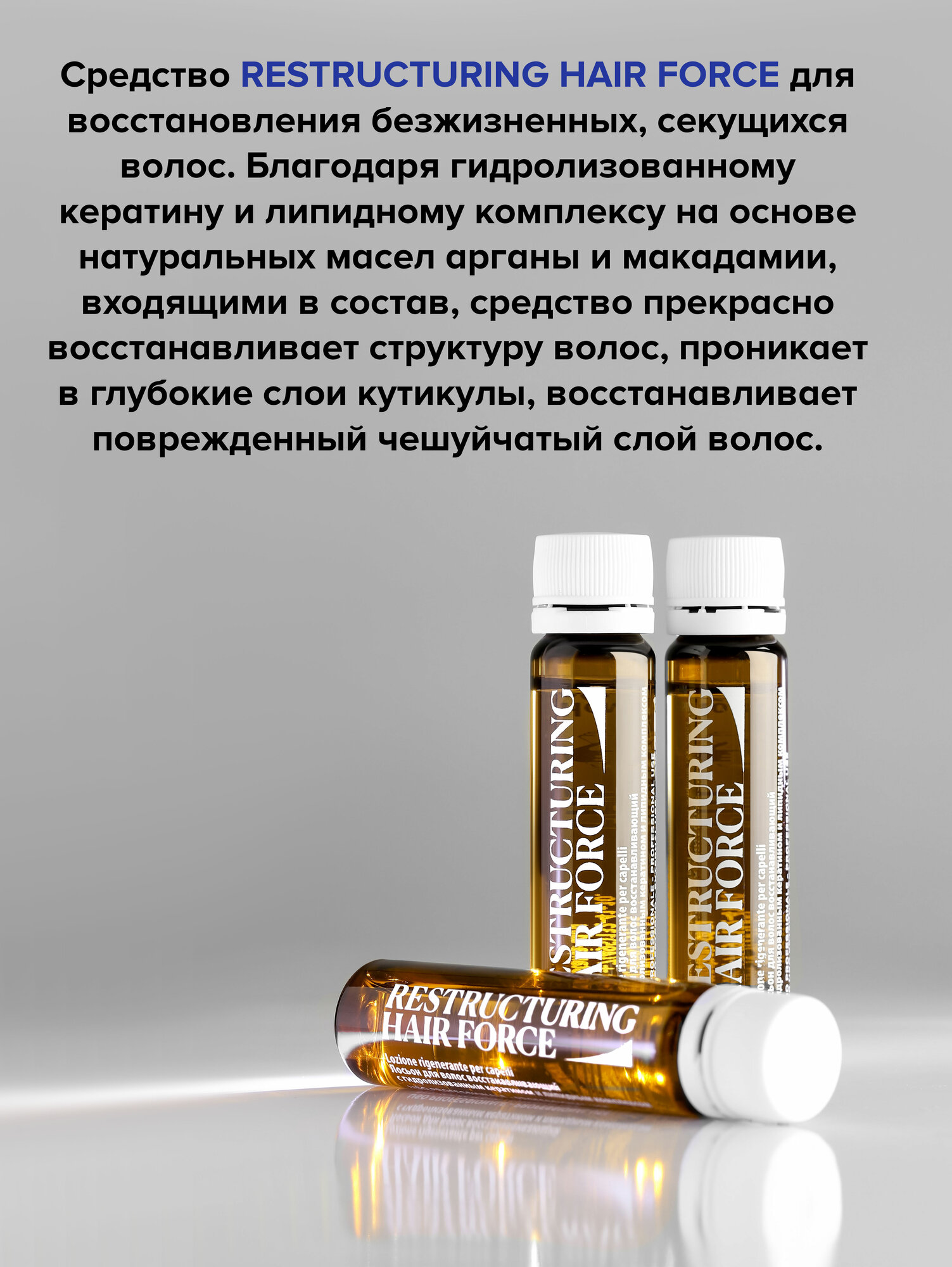 Средство RESTRUCTURING HAIR FORCE для восстановления безжизненных, секущихся волос. Благодаря гидролизованному кератину и липидному комплексу на основе натуральных масел арганы и макадамии, входящими в состав, средство прекрасно восстанавливает структуру волос, проникает в глубокие слои кутикулы, восстанавливает поврежденный чешуйчатый слой волос. Прекрасно увлажняет, питает изнутри, придает эластичность волосам. Для восстановления тонких, ослабленных волос. E-COSMETIC – официальный поставщик CONSTANT DELIGHT.