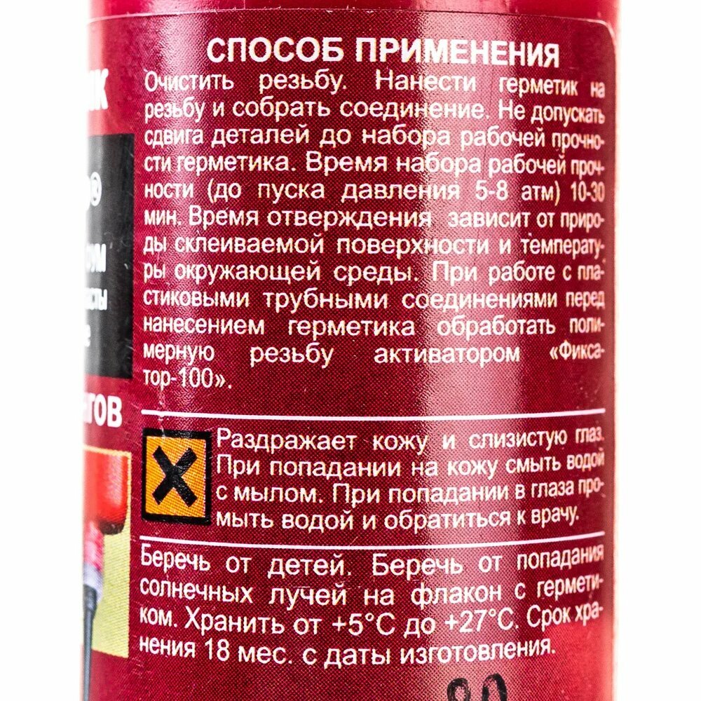 Фиксатор №3Ф – анаэробный фторопластовый клей-герметик ускоренного отверждения. Применяется для герметизации стандартной цилиндрической и конической металлической трубной резьбы (зазор не более 0,6мм) размером от 1" до 3" в системах горячего и холодного водоснабжения, отопления, газоснабжения, подачи сжатого воздуха, смазочно-охлаждающих гидравлических жидкостей, топлив и масел в трубопроводах, испытывающих при эксплуатации умеренные вибрационные нагрузки. Клей-герметик обладает повышенной реакционной способностью на неактивных поверхностях.