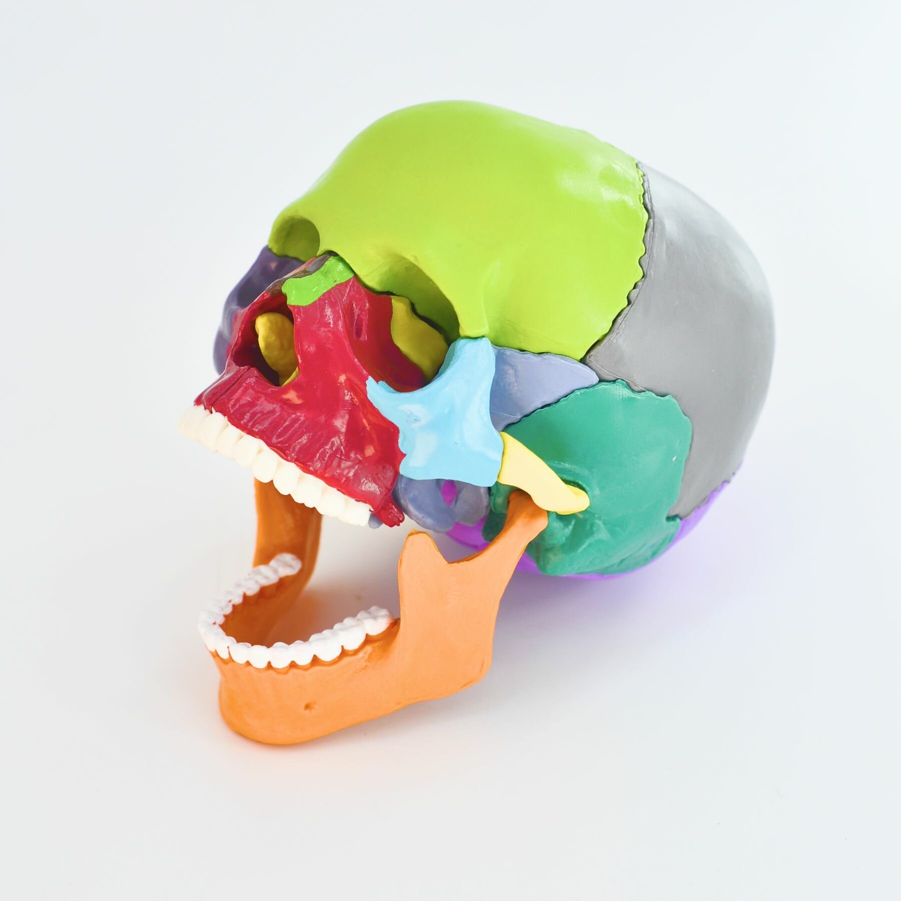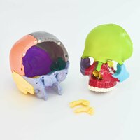 Модель идеально подходит для изучения черепа человека. На черепе обозначены анатомические образования. Модель черепа человека подойдет для художников и скульпторов, для рисования и создании скульптур. Данная модель является обучающей, подойдет для врачей, школьников, для подготовки к ЕГЭ, стоматологов. По данной модели можно изучать строение отдельных костей скелета человек, строение челюсти, височно-нижнечелюстного сустава . Можно использовать для препарирования зубов в качестве фантома. Характеристики изделия *Модель состоит из 15 пластмассовых деталей. *Модель позволяет рассмотреть строение черепа и продемонстрировать расположение костей черепа относительно друг друга. *На модели обозначены следующие детали: 1. Лицевой отдел 2. Мозговой отдел (нижнечелюстная кость; - лобная кость; - верхнечелюстные кости; - теменные кости; - скуловые кости; - височные кости; - носовые кости. - клиновидные кости; - затылочная кость.) Такая модель может служить декорацией, можно применять для демонстраций в институте и школе. Подойдет для изучения таких предметов как: биология, анатомия, топографическая анатомия. Врачи(хирурги, нейрохирурги) используют как наглядную демонстрацию для своих пациентов.