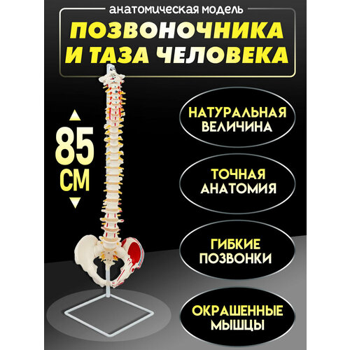 Анатомическая модель позвоночника и таза человека с окрашенными мышцами в натуральную величину 85 см премиум качества - идеальное решение для углубленного изучения анатомии.