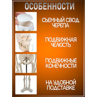 Крышка черепа съемная. Нижняя челюсть черепа подвижная, на пружинке. Верхние и нижние конечности легкосъемные. Скелету придана естественная поза стоящего человека. Позвоночник негнущийся. Ребра, тазовые кости и череп жестко соединены с позвоночником. Конечности присоединяются на шарнирах.